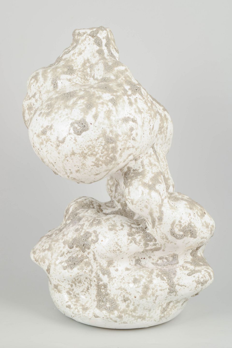 Christina Muff, Danish contemporary ceramicist (b. 1971). Large hand modeled, organic shaped, stoneware vessel. The glaze is glossy white with splashes of grey, matte glitter, lending a resemblence to wet sand. This piece is from Christina Muff's 'Helium' series.