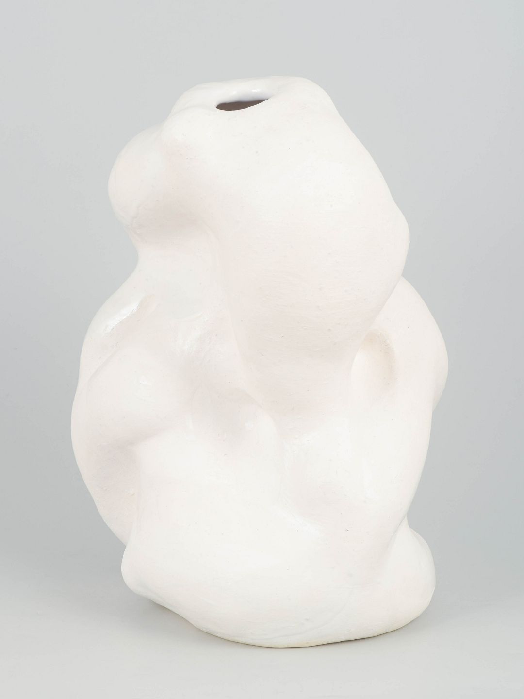 Large hand modeled, organic shaped, stoneware vessel. This piece is covered in a thin layer of white, matte porcelain and areas with glossy white glaze. This piece is from Christina Muff's 'Helium' series.