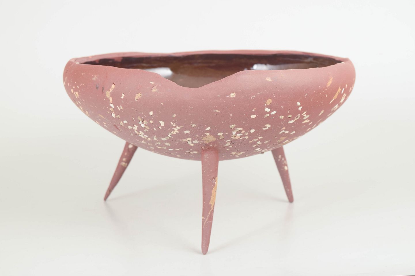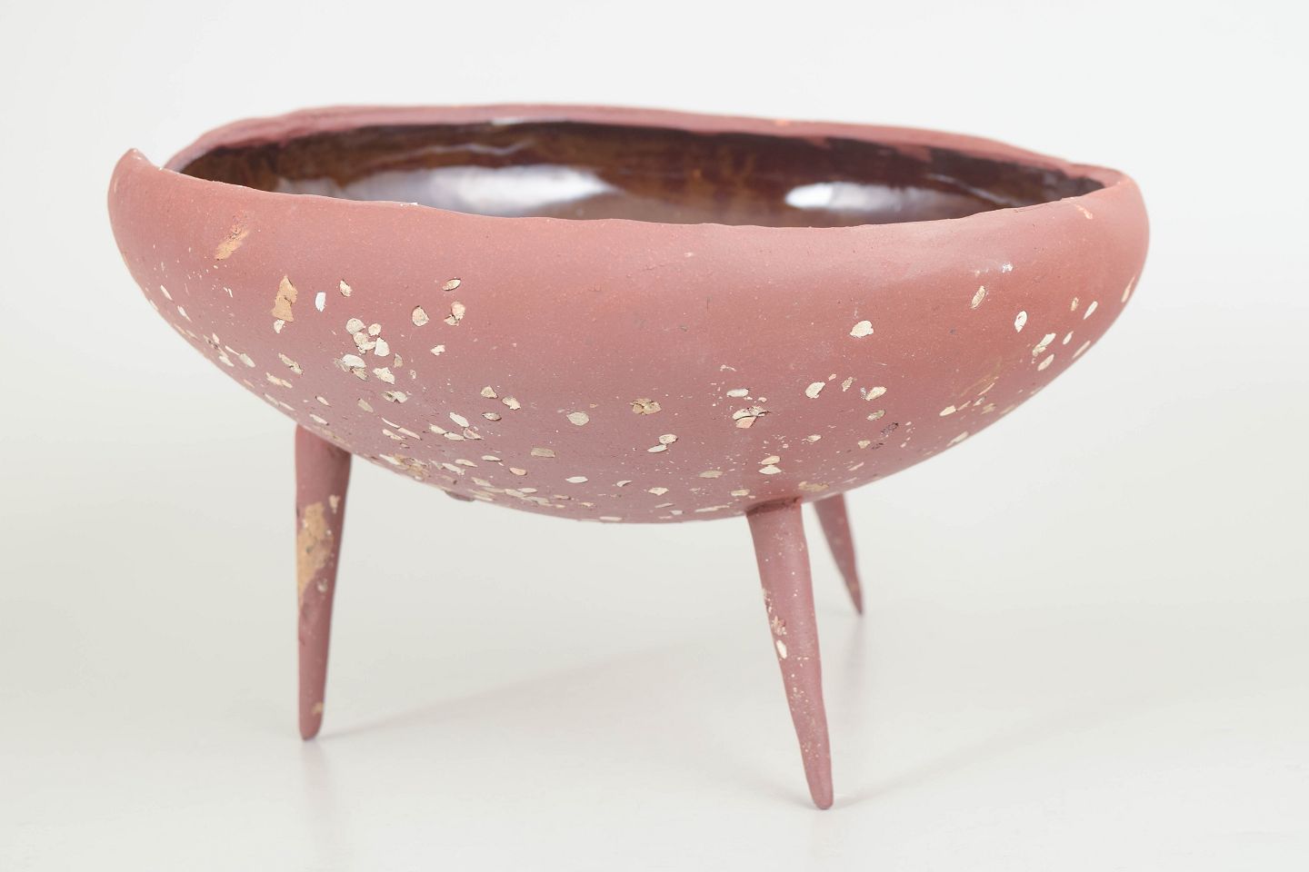 One of a kind red stoneware bowl on three pointed legs. unglazed on the outside the beautiful red clay compliments the interior which is covered in a dark celadon glaze.