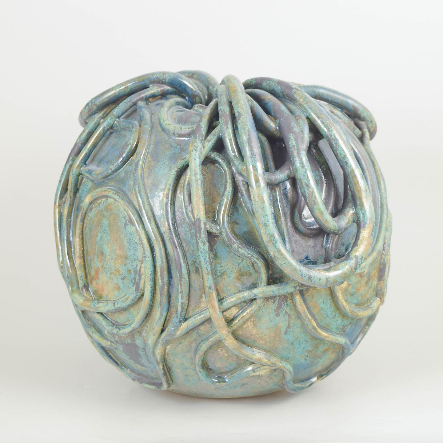 Very large stoneware vessel. The glaze is greenish turqouise with black and golden hues.