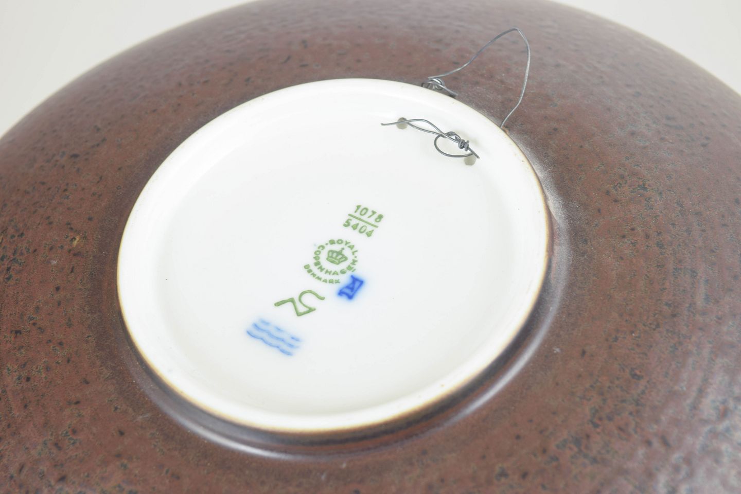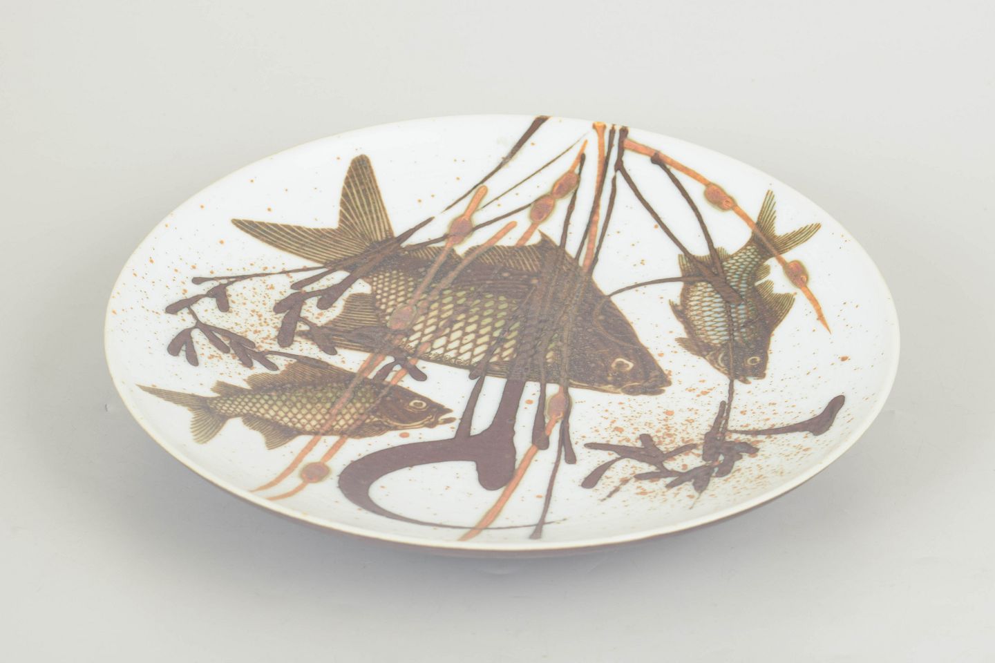 Circular porcelain dish decorated with detailed fish and underwater motifs in brown and golden tones on a white ground. Model 1078/5404, dated 1965, first factory quality.