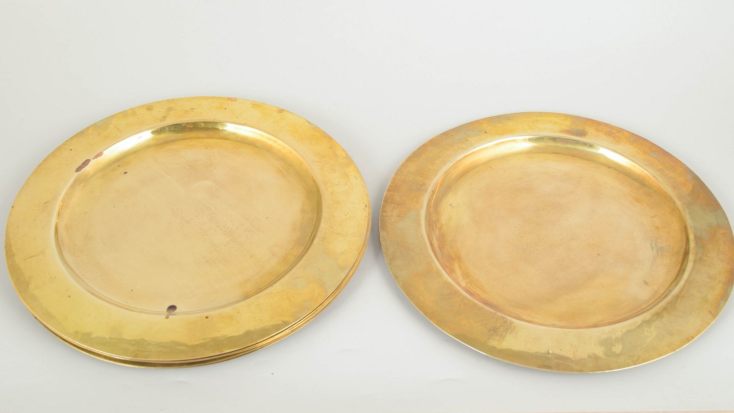 Scandinavian design, set of six brass charger plates.