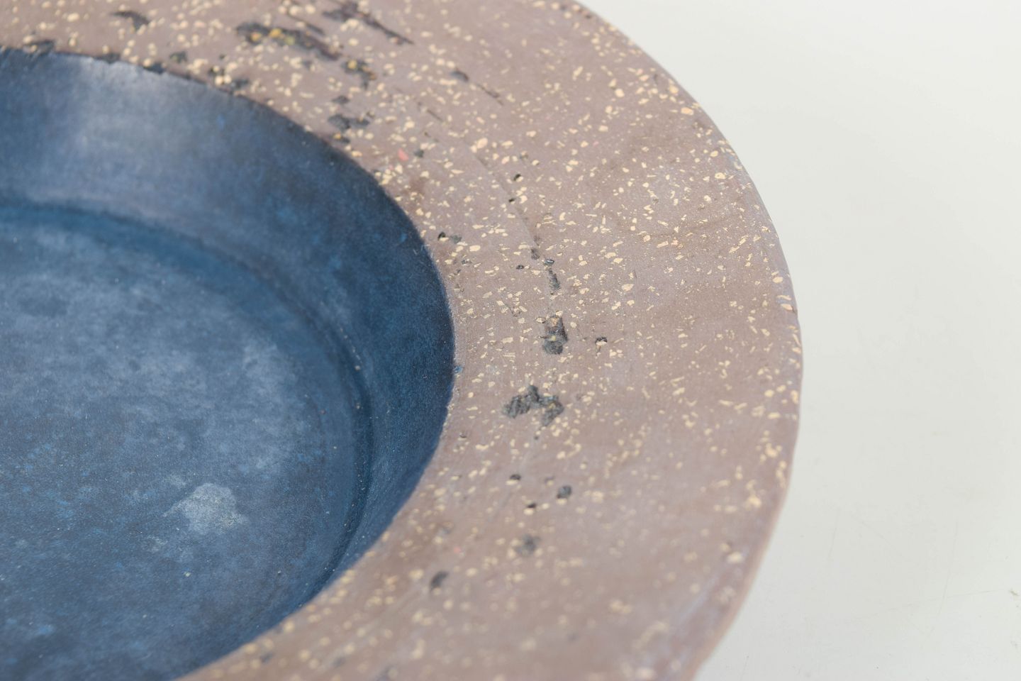 Decorative circular stoneware dish with matte glaze in blue and sandy tones with a speckled surface. Model 4070B.