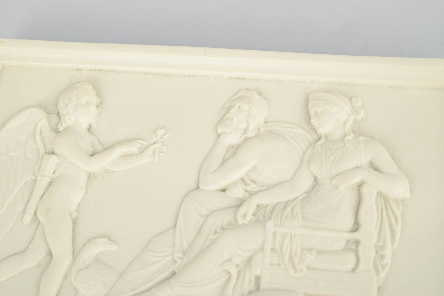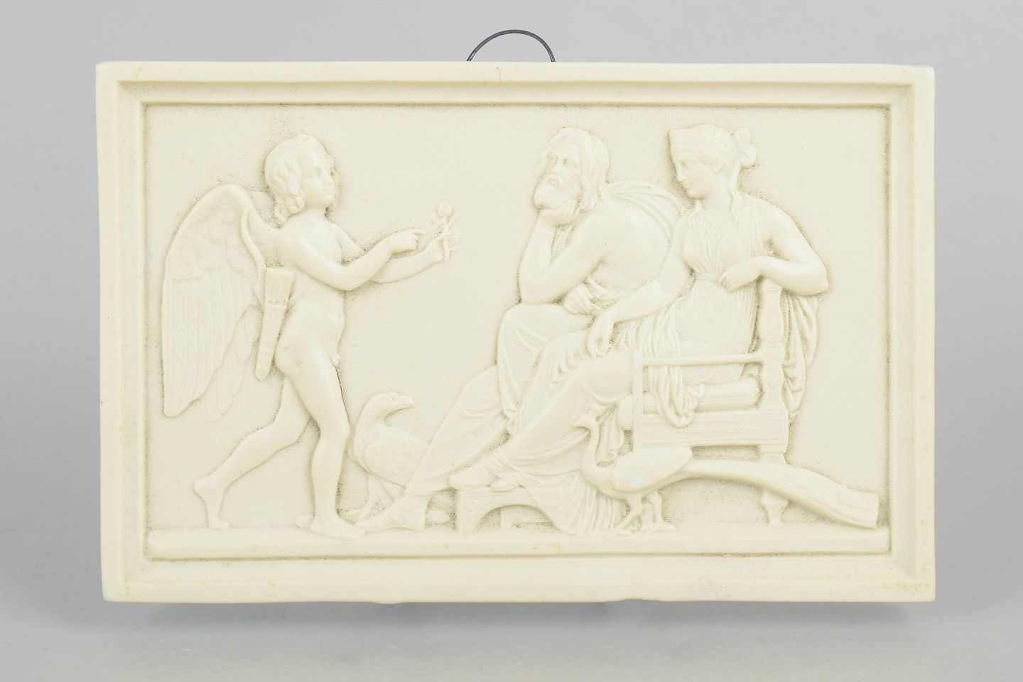 Rectangular wall relief in white biscuit porcelain featuring a classical figural motif after Bertel Thorvaldsen, executed with refined detailing and soft modelling in the neoclassical style.