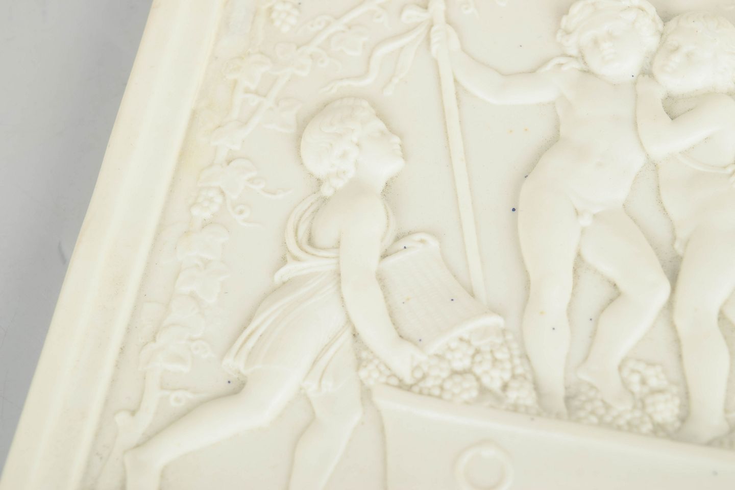 Rectangular wall relief in white biscuit porcelain depicting a classical composition with putti after Bertel Thorvaldsen, executed with refined detailing and soft modelling in the neoclassical style.