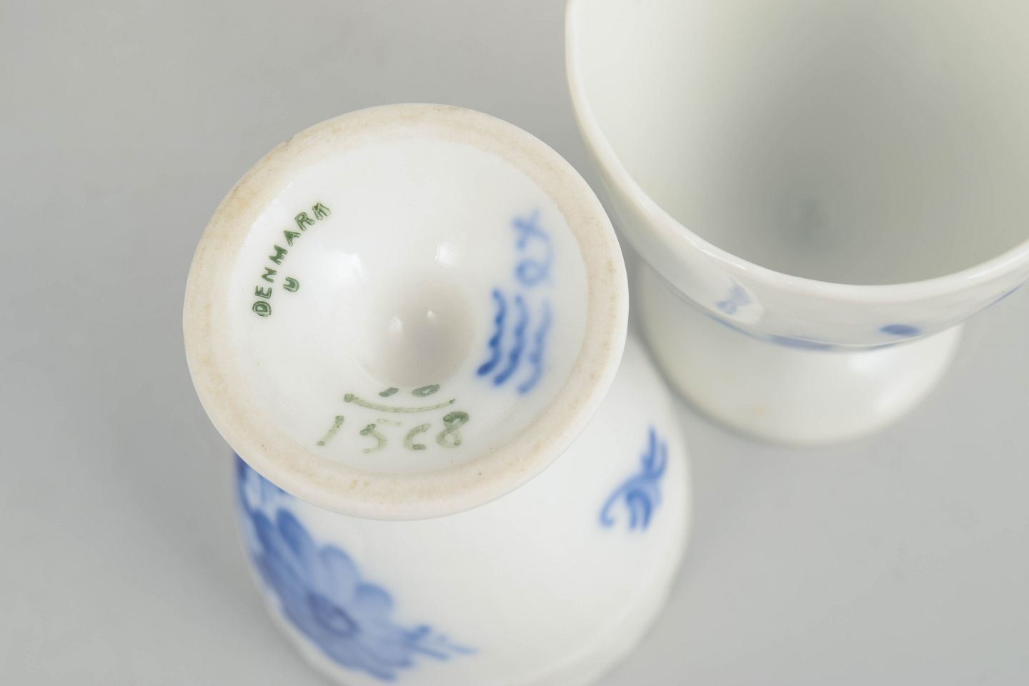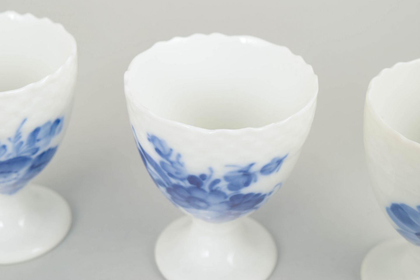 Set of three porcelain egg cups decorated with hand-painted blue floral motif in relief. Model number 10/1568, 1st factory quality, early 20th century.
