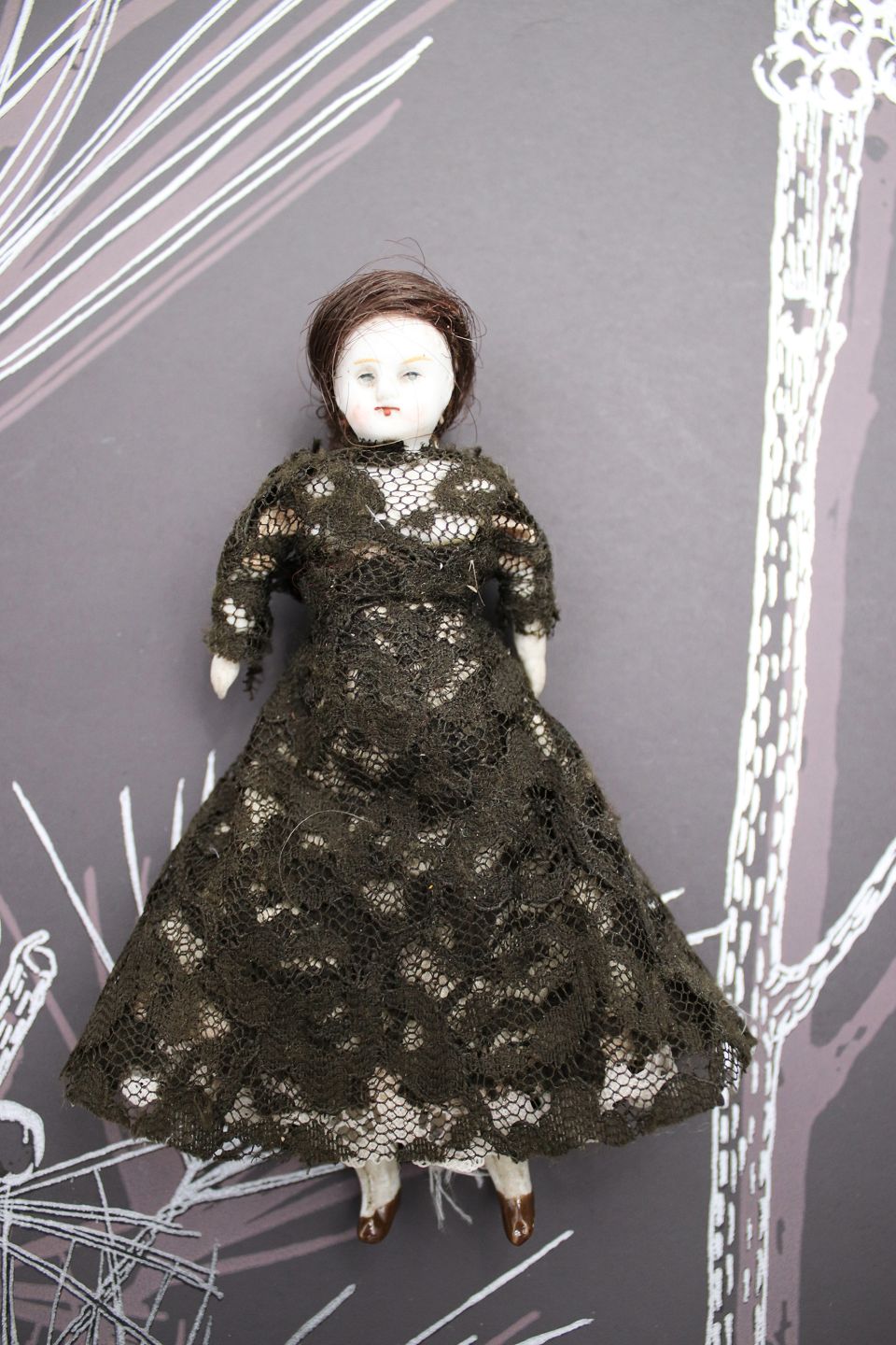 2) H: 13.5cm. Girl with head, hands and feet in porcelain, body in fabric and dressed in old lace dress - PRICE: 500 DKK. RESERVED!