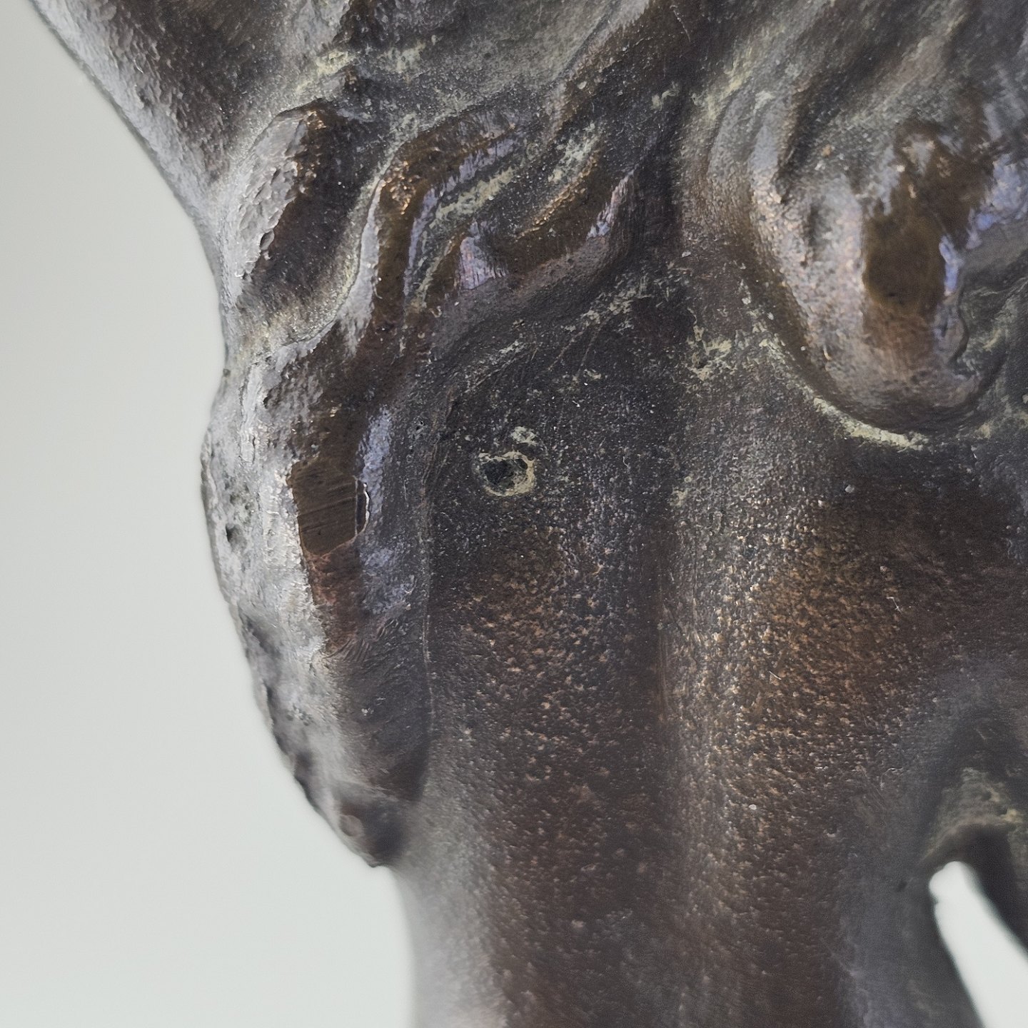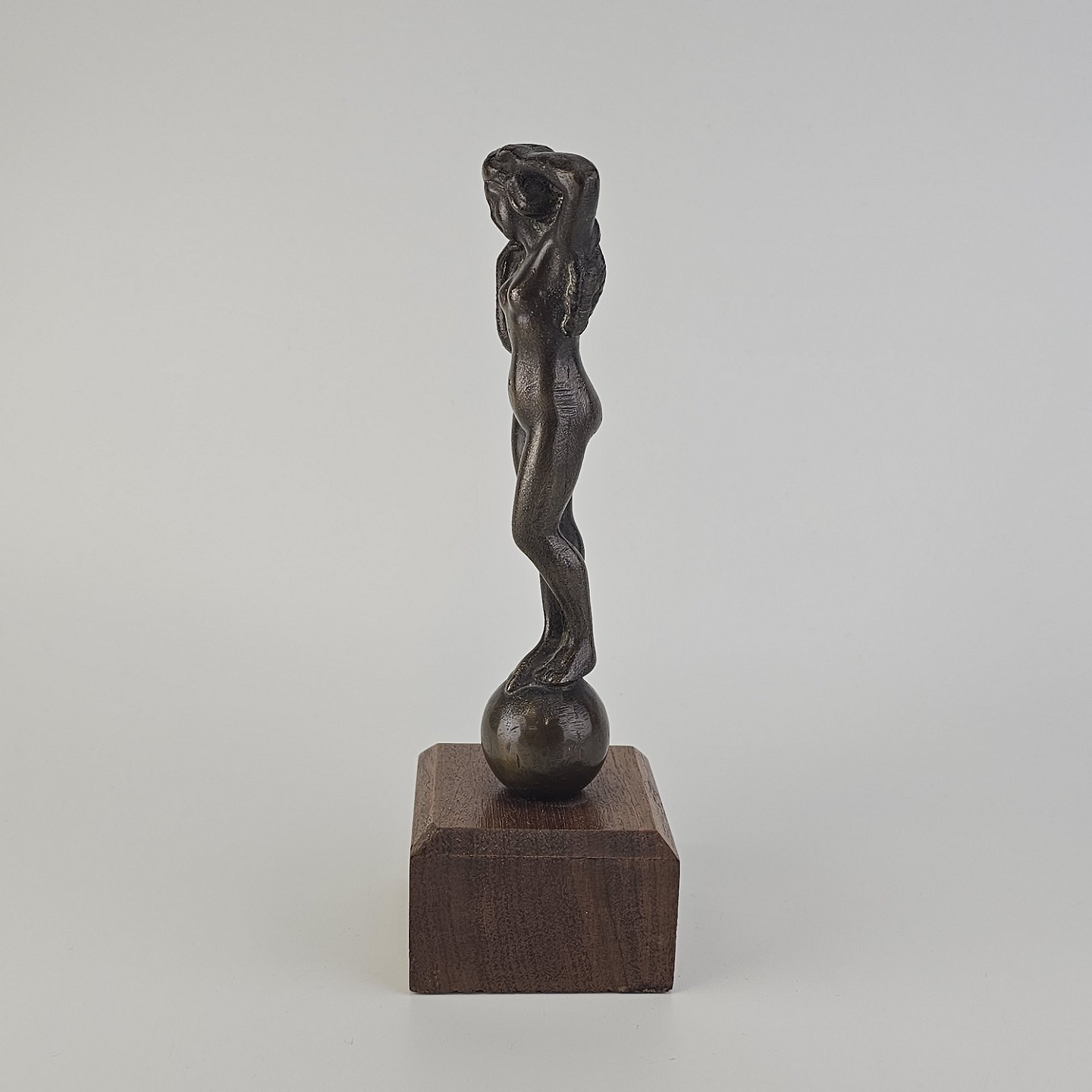 Figur med motiv af en kvinde på træsokkel, bruneret messing