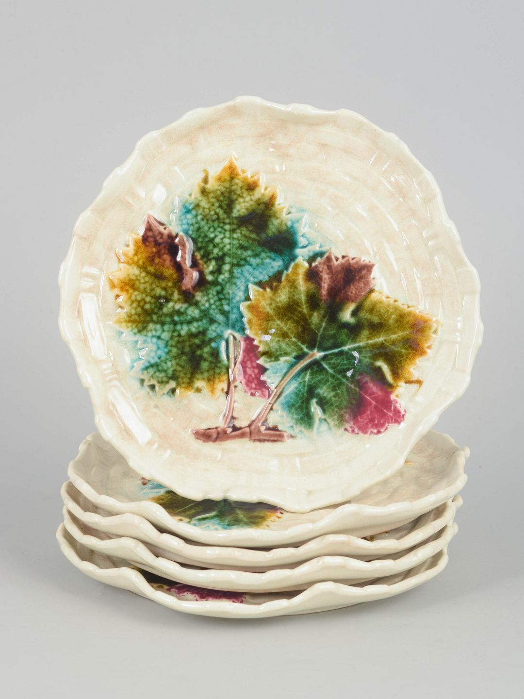 Decorative faience plates with relief and hand-painted decoration depicting foliage in multicoloured glazes.