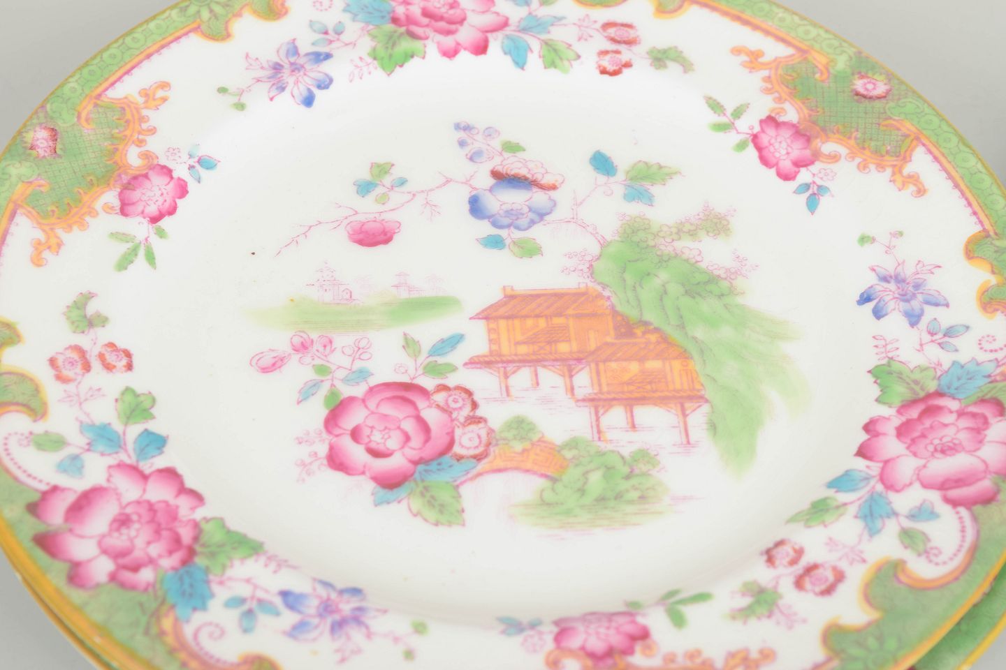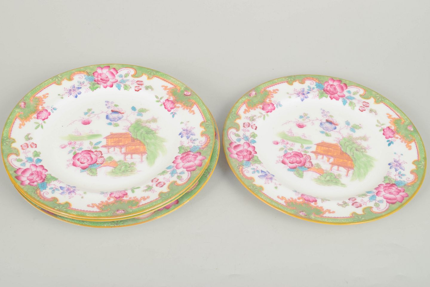 Decorative porcelain salad plates with colourful floral and scenic decoration in the Temple pattern, featuring central oriental motifs and a green border.