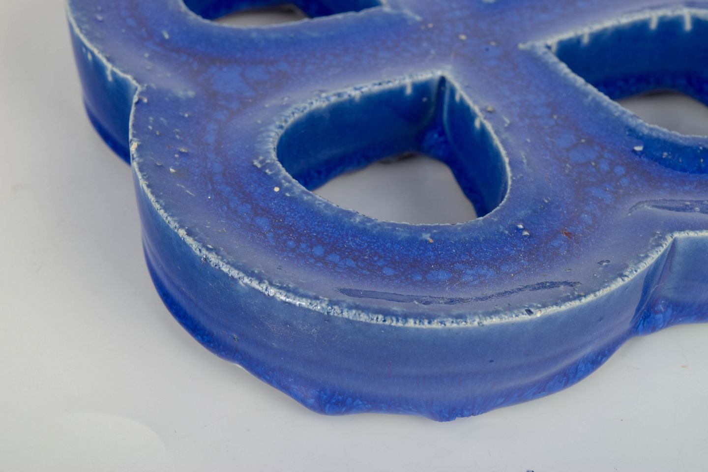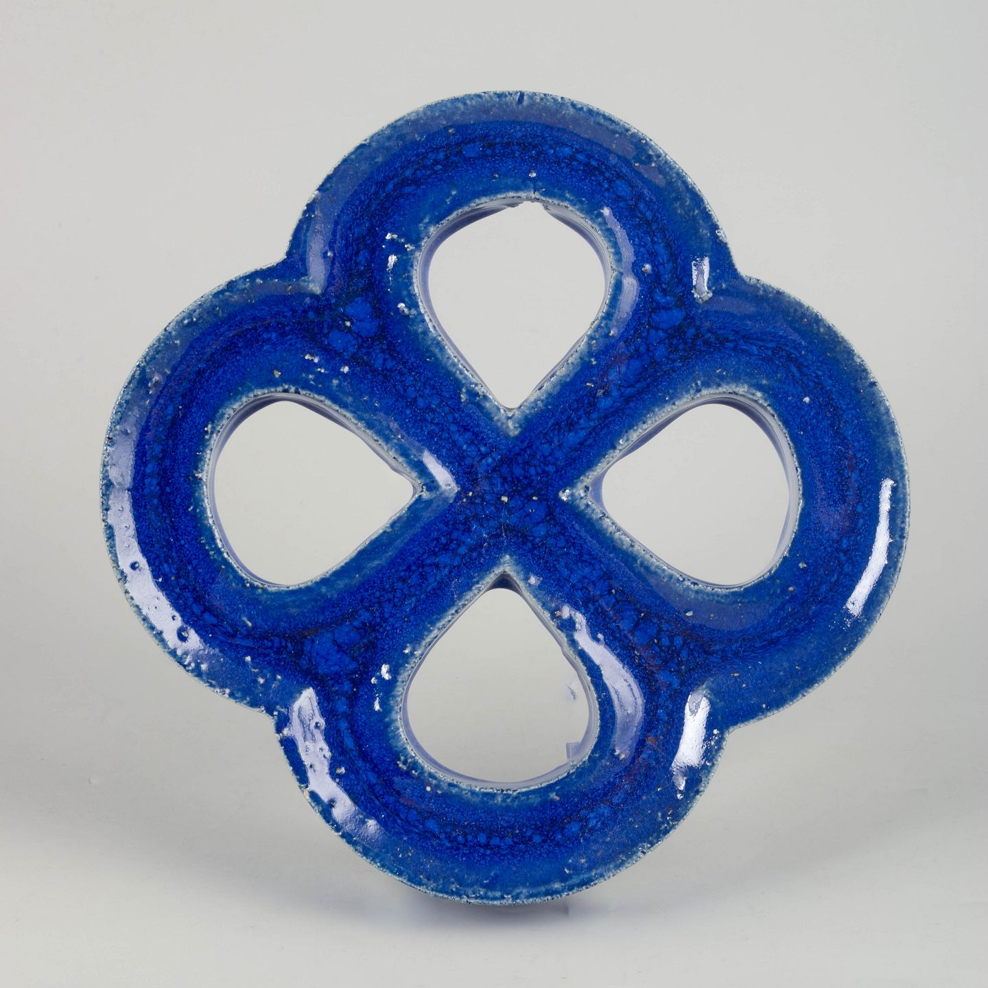 Decorative stoneware wall relief in an organic four-lobed form with open sections. Finished in a deep blue glaze with lively bubbling effects and surface variation. Reverse with hole for wall mounting.