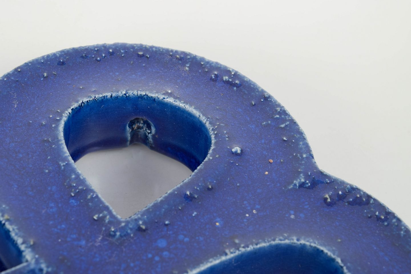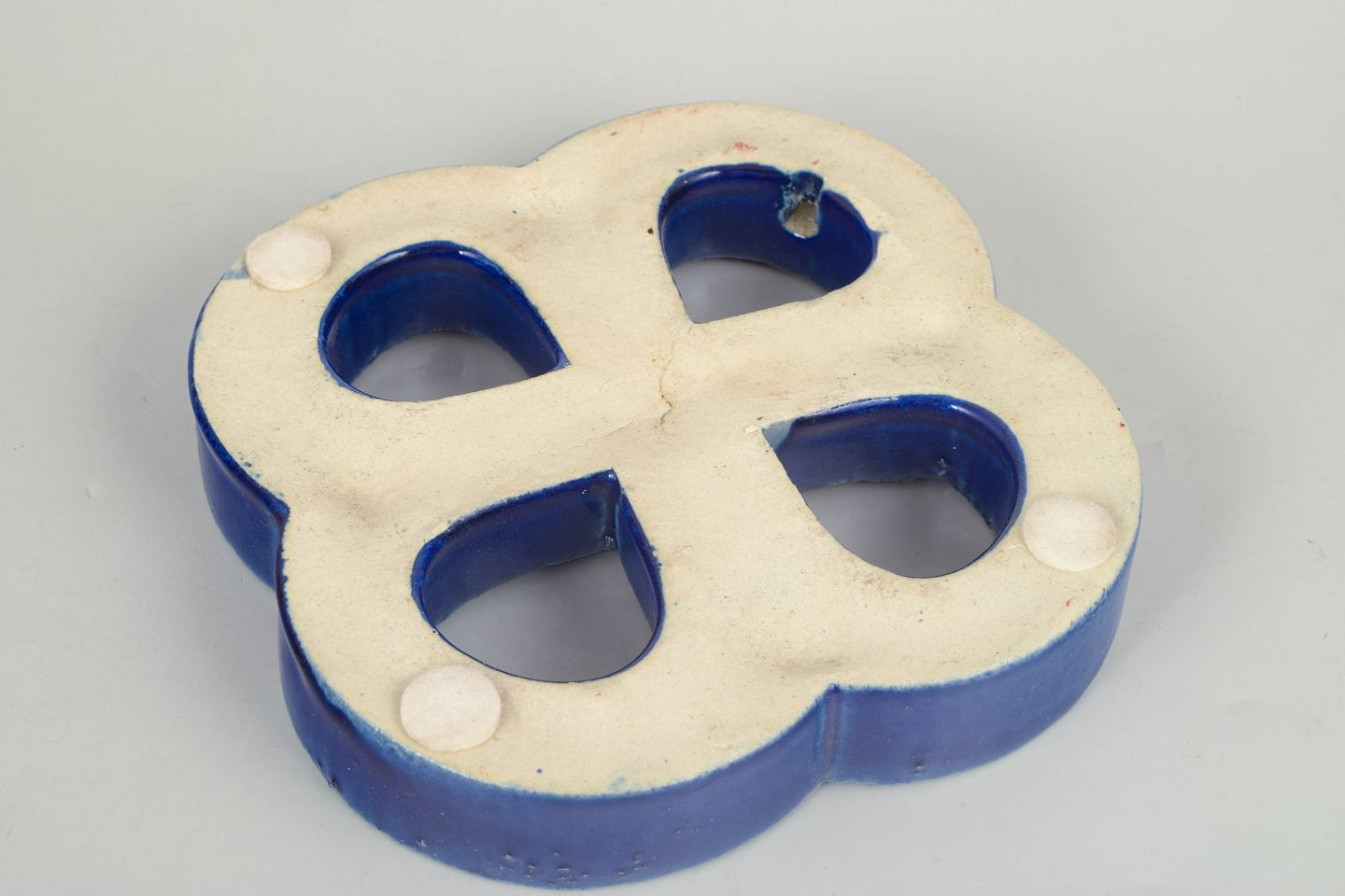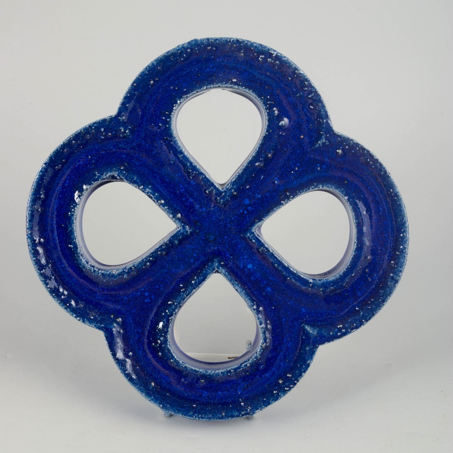 Decorative stoneware wall relief in an organic four-lobed form with open sections. Finished in a deep blue glaze with lively bubbling effects and surface variation. Reverse with hole for wall mounting.