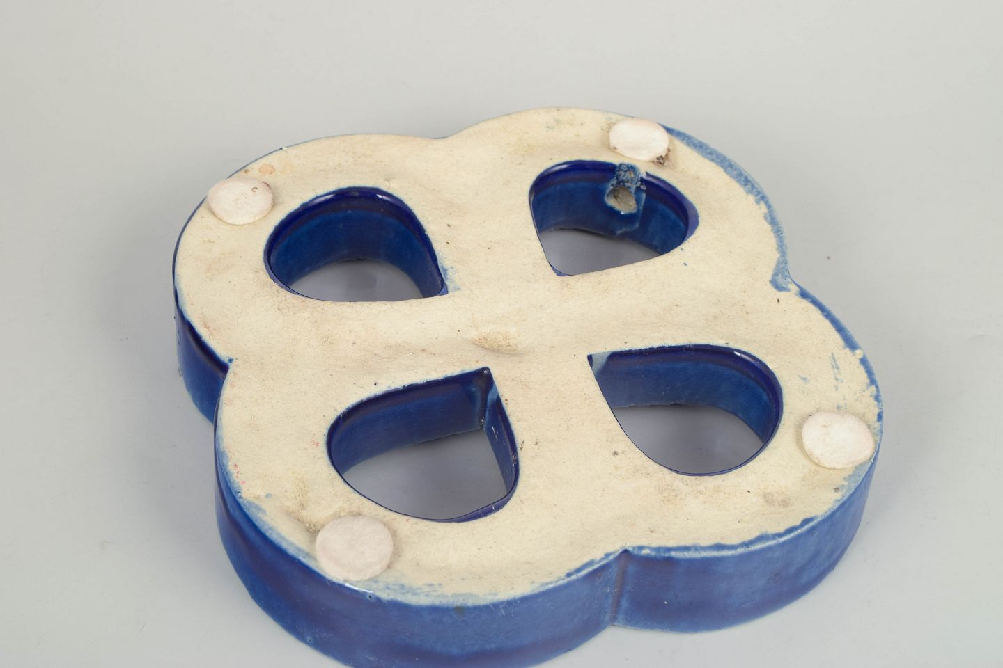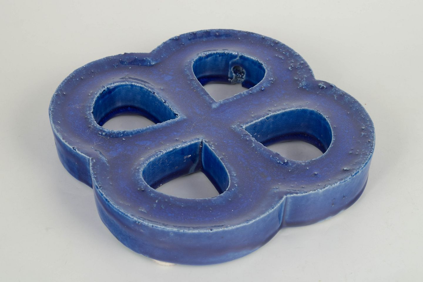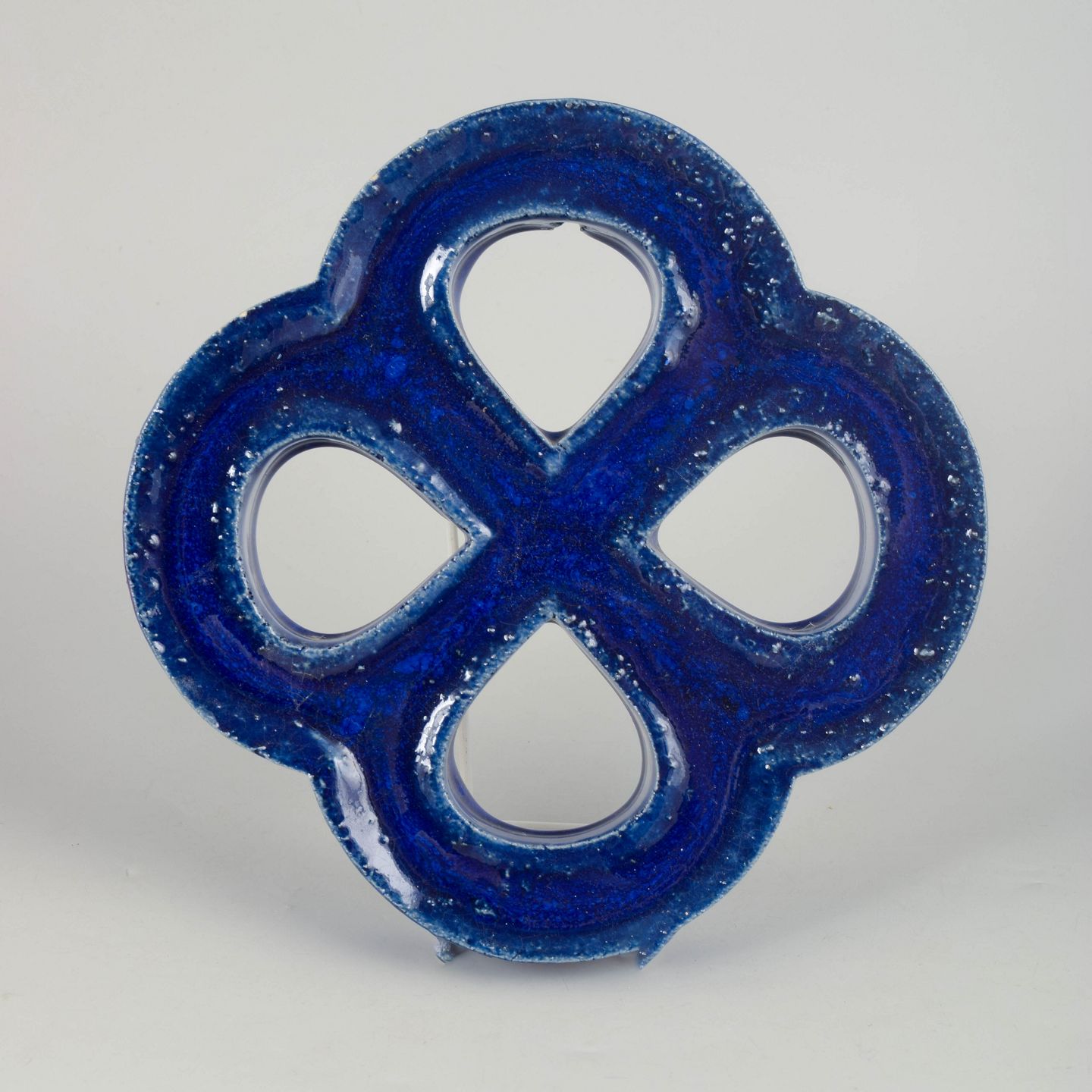 Decorative stoneware wall relief in an organic four-lobed form with open sections. Finished in a deep blue glaze with lively bubbling effects and surface variation. Reverse with hole for wall mounting.