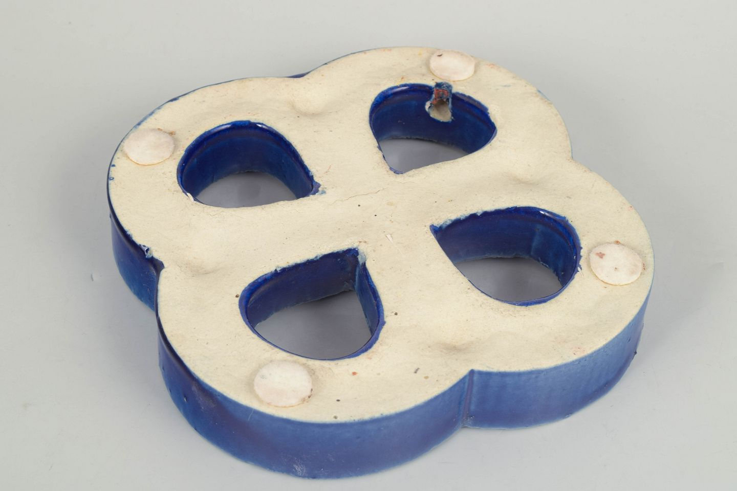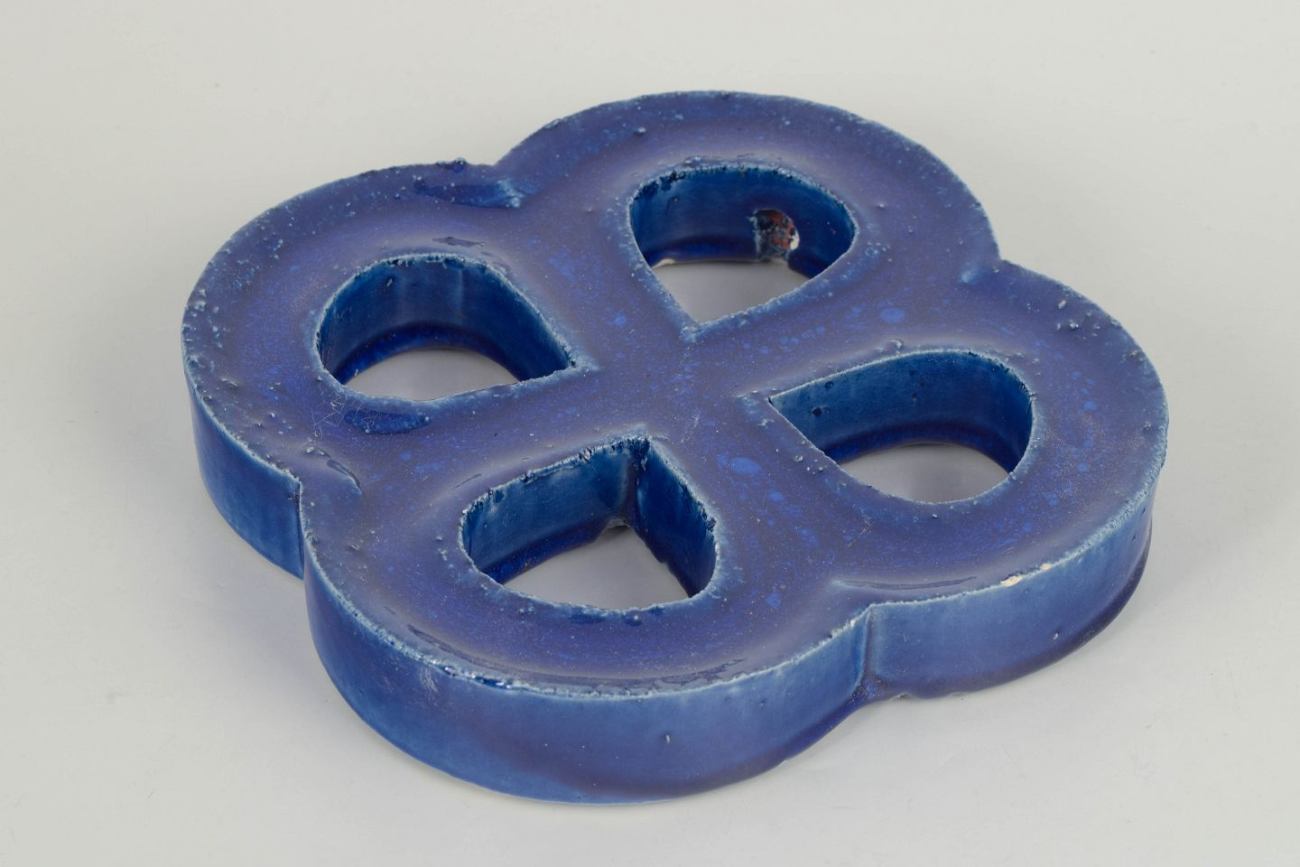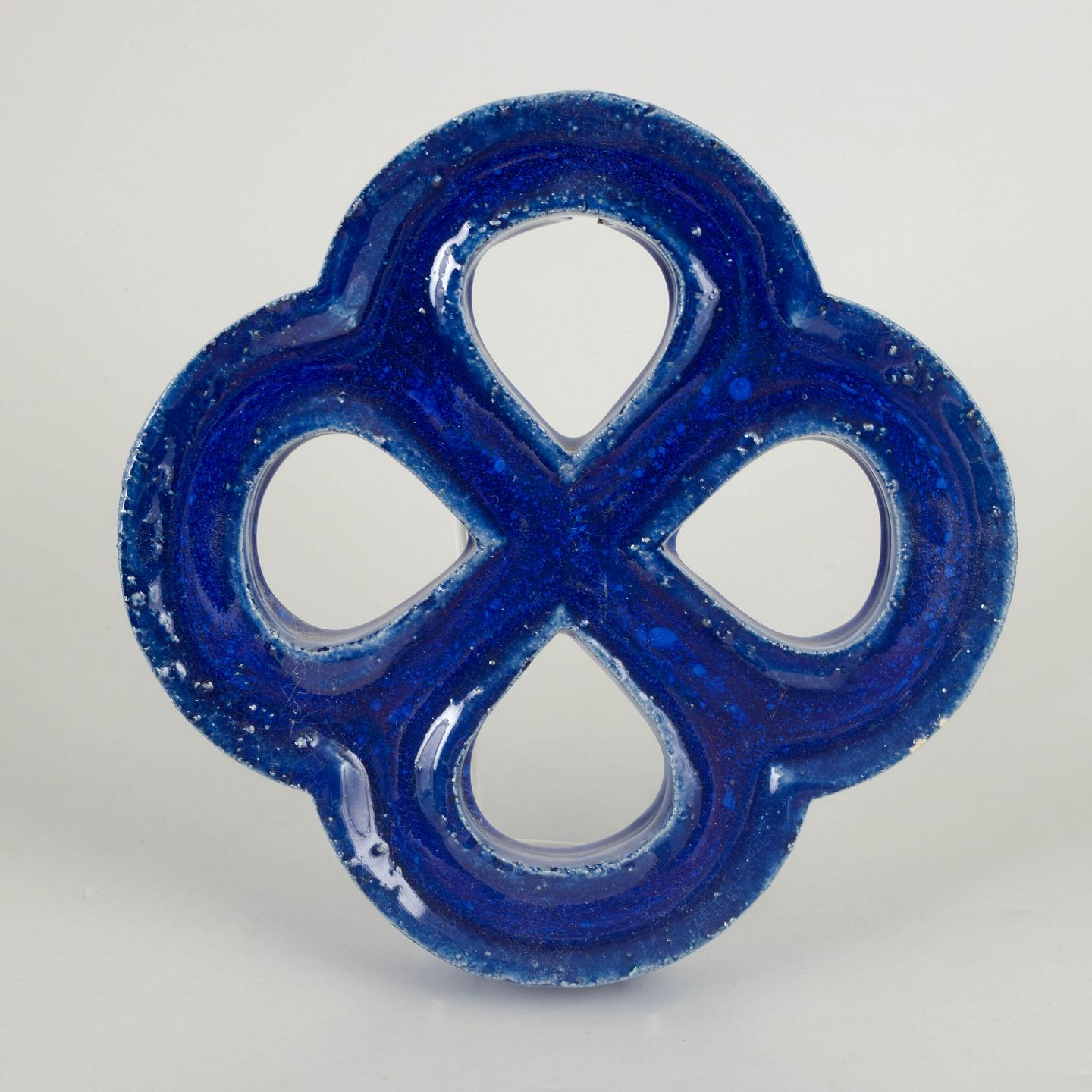 Decorative stoneware wall relief in an organic four-lobed form with open sections. Finished in a deep blue glaze with lively bubbling effects and surface variation. Reverse with hole for wall mounting.