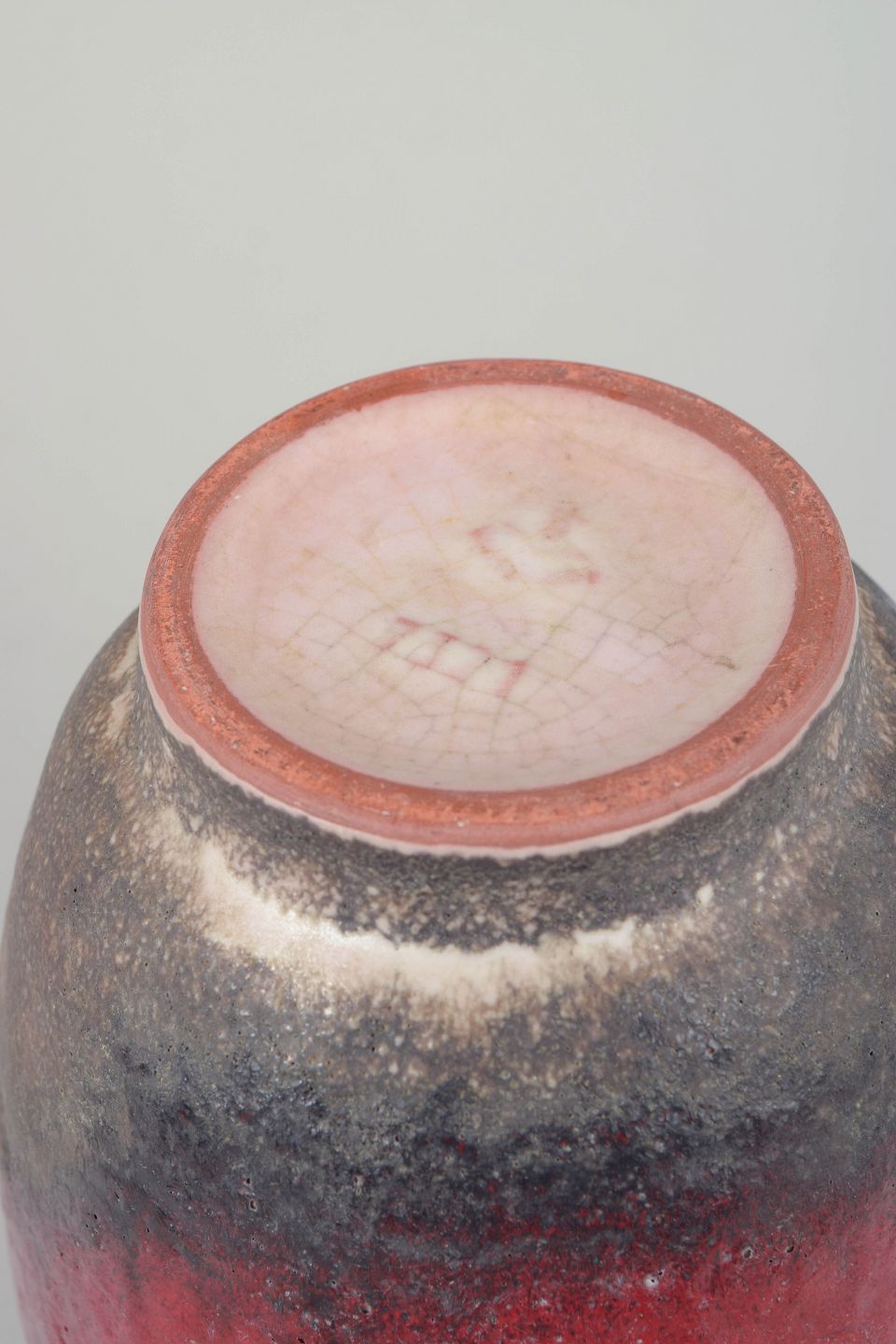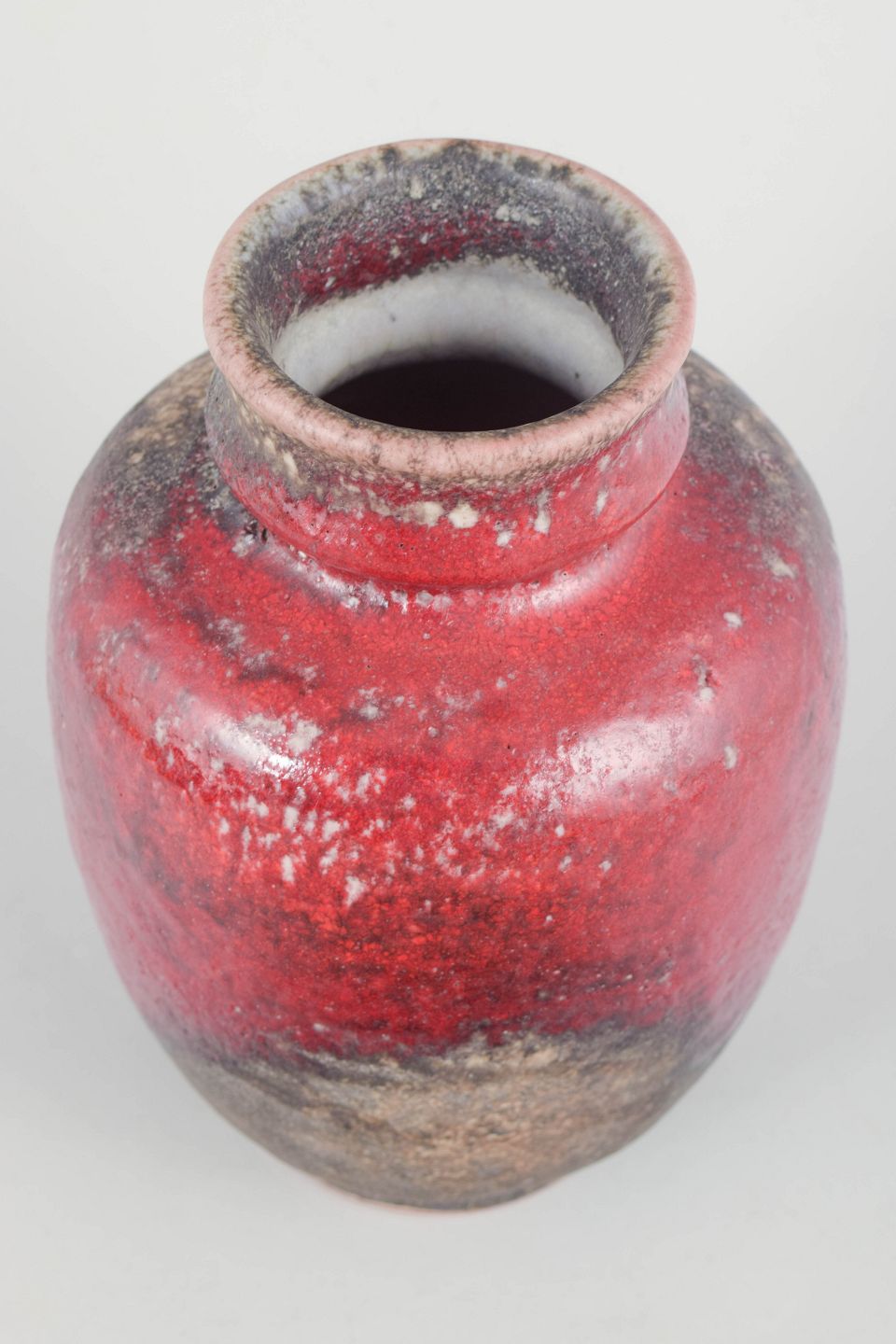 Ceramic vase with characteristic lava glaze in deep red and dark tones, featuring a heavily textured and organic surface. Model 7321.