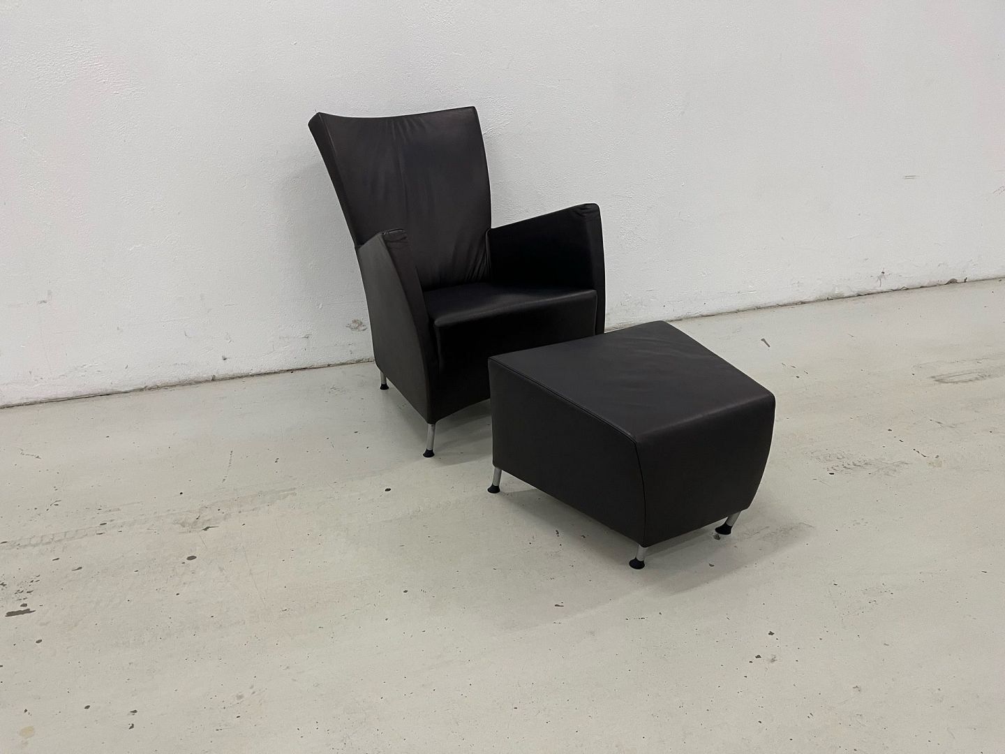 Designer: Gijs PapavoineWindy chair w/stool in black Panama leather and with chromed steel legs. The chair has been renovated and is in like new condition, and has been used sparingly, comes from a pet/smoke/child free home. Original new price. 24,490,-