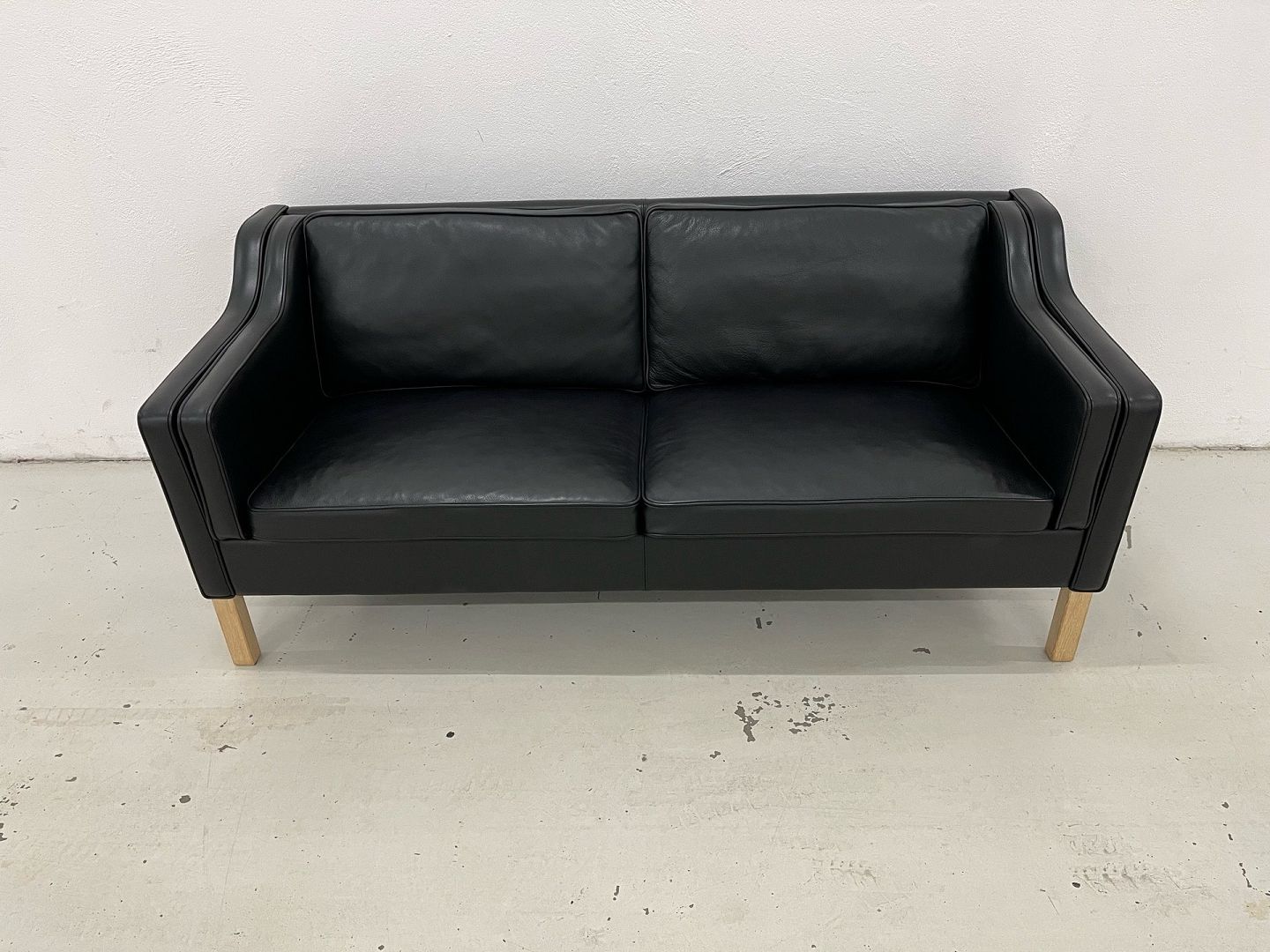 Exclusive Mogens Hansen MH 195 - 2.5-seater sofaThis exclusive 2.5-seater sofa from designer Mogens Hansen, model MH 195, is presented in black Odin 18 leather (group 2) with elegant legs in soap-treated oak. The sofa's original new price was DKK 37,511. PS. The sofa has removable legs if you want a different type of wood or metal legs. The sofa is extremely well maintained and has only been used minimally. It comes from a smoke-free and pet-free home without children. It has recently been professionally cleaned and leather-treated, and therefore appears in particularly beautiful condition - close to new and without faults or defects. The design is classic and timeless, which makes the sofa suitable for a wide range of interiors. It is made with seat inserts that ensure optimal comfort and a harmonious expression. The combination of aesthetics and functionality makes the sofa an obvious choice for the quality-conscious buyer who wants both style and high seating comfort. Dimensions: Length: 179 cm Depth: 80 cm Height: 76 cm Seat depth: 51 cm Seat height: 42 cm