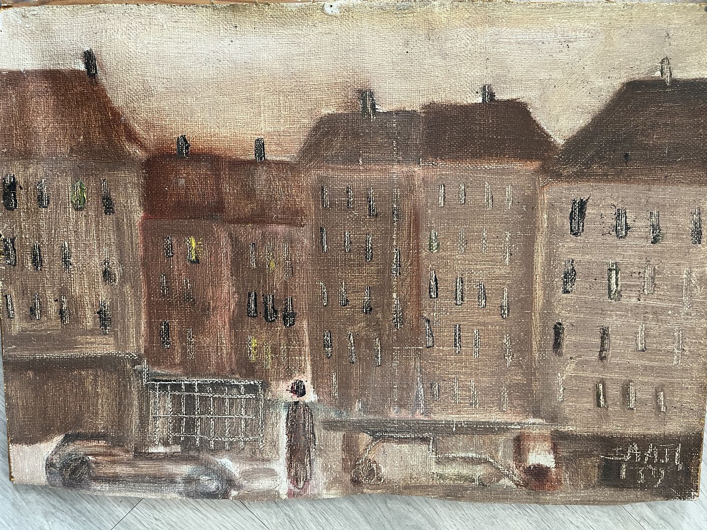 Text available in Danish: Maleri af Svend Aage Tauscher - Byparti med bil og personer 1959.