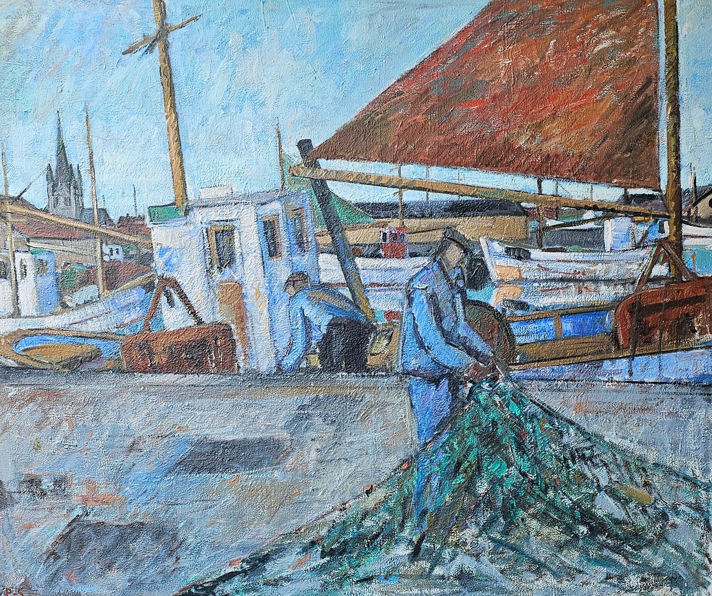 Oliemaleri på plade monteret i guldmalet ramme med motiv af en fisker på havnen i Frederikshavn