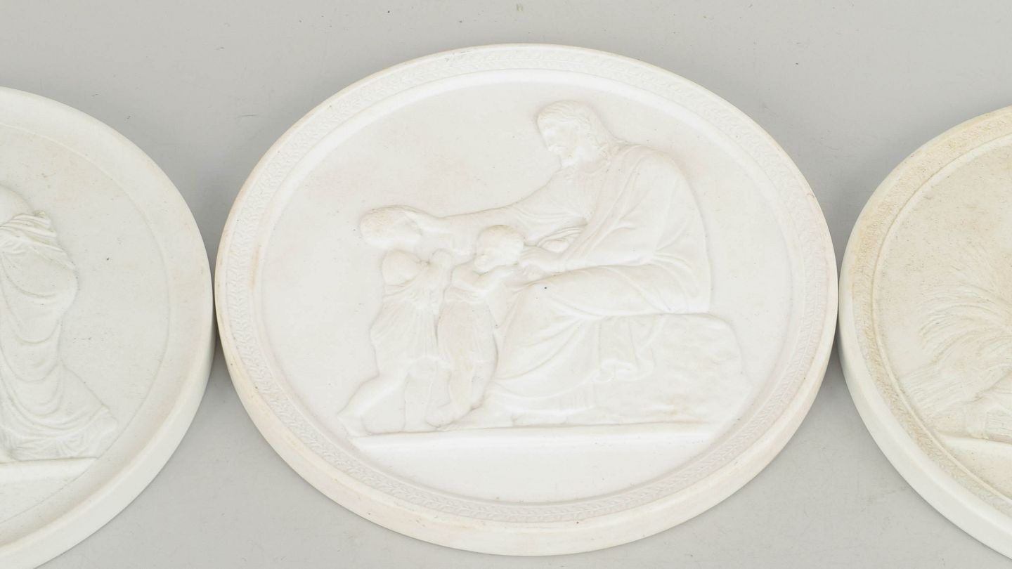 White unglazed porcelain reliefs with classical motifs after Bertel Thorvaldsen, executed in fine biscuit with detailed figural decoration and suspension mounts on the reverse. First and third factory quality.