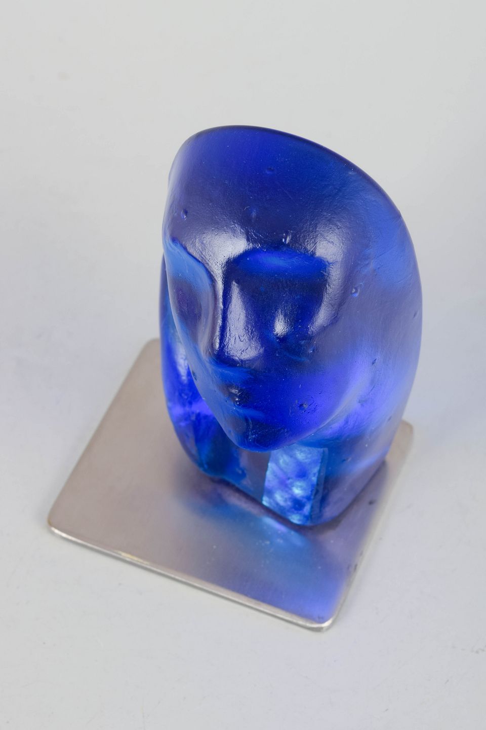 Organically shaped sculpture in mouth-blown glass with a deep blue tone and encapsulated figurative elements. Signed by the artist and produced in her own studio.