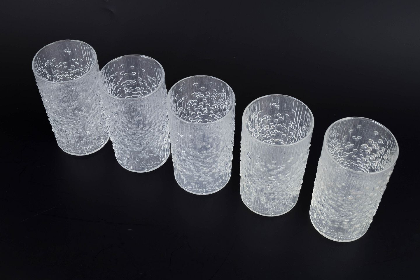 Set of five drinking glasses in pressed glass featuring a distinctive organic texture and relief pattern that creates a lively interplay of light across the surface. The design is a classic example of Finnish glass design from the period. Hopla model in clear glass.