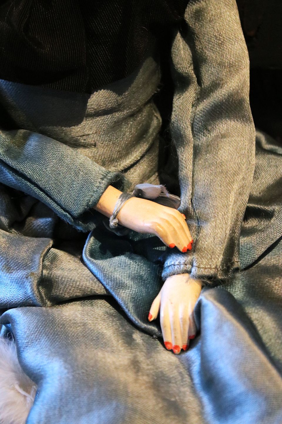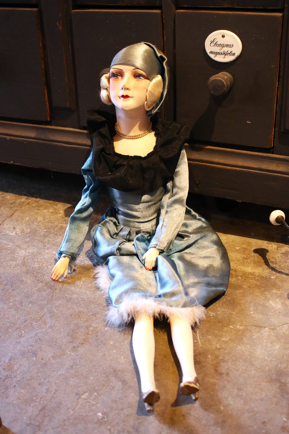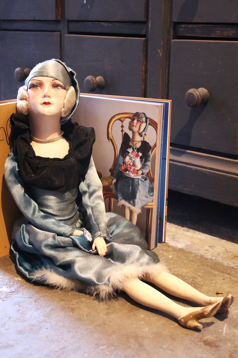 Old French vintage boudoir doll in fabric with silk dress. Height: 72cm. (The doll has been pictured in Shane Brox's children's book "Build a Better World")