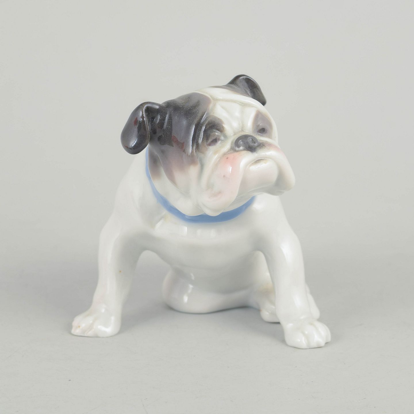 Naturalistically modelled porcelain figure of a French bulldog with hand-painted details in grey, white and pink tones.