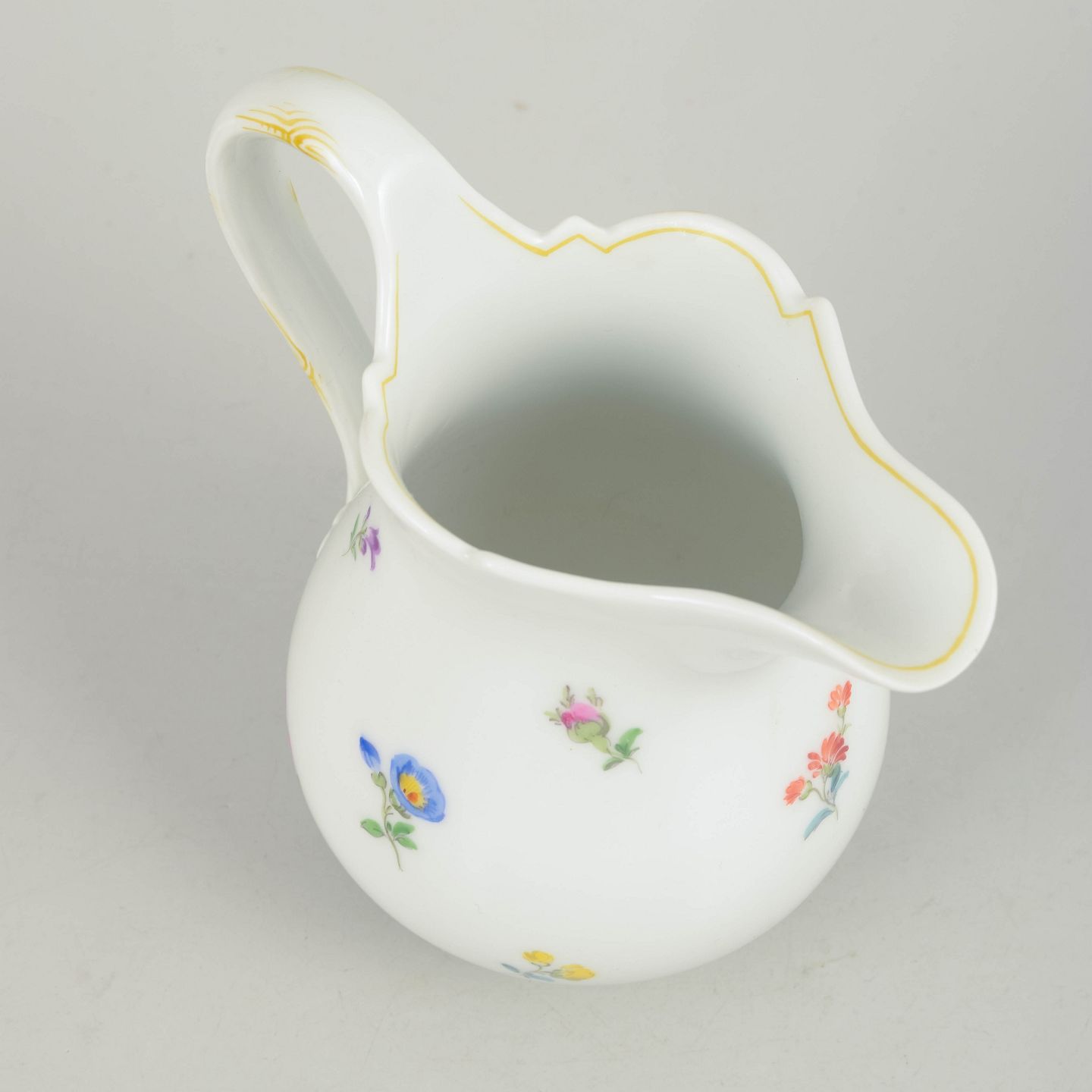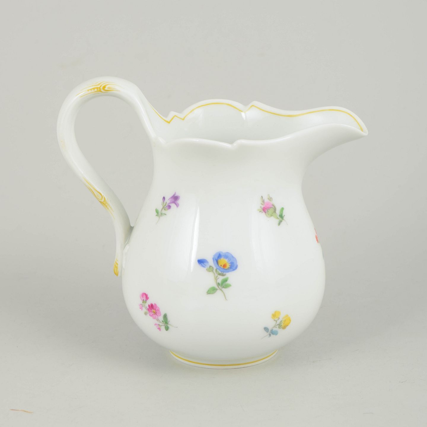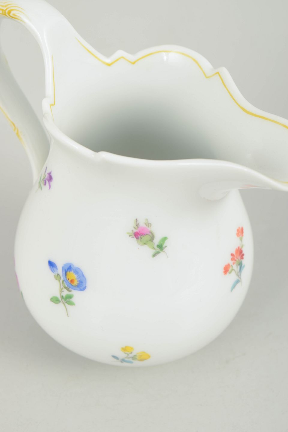 Large porcelain creamer hand painted with scattered polychrome flowers and a gilt rim. Elegant form with curved handle and scalloped edge, executed in classic Meissen style from the mid 20th century. Marked on the base with Meissen crossed swords, first factory quality.