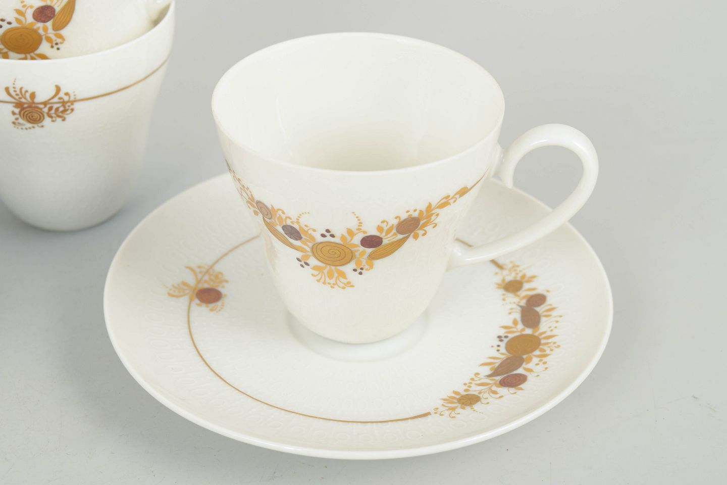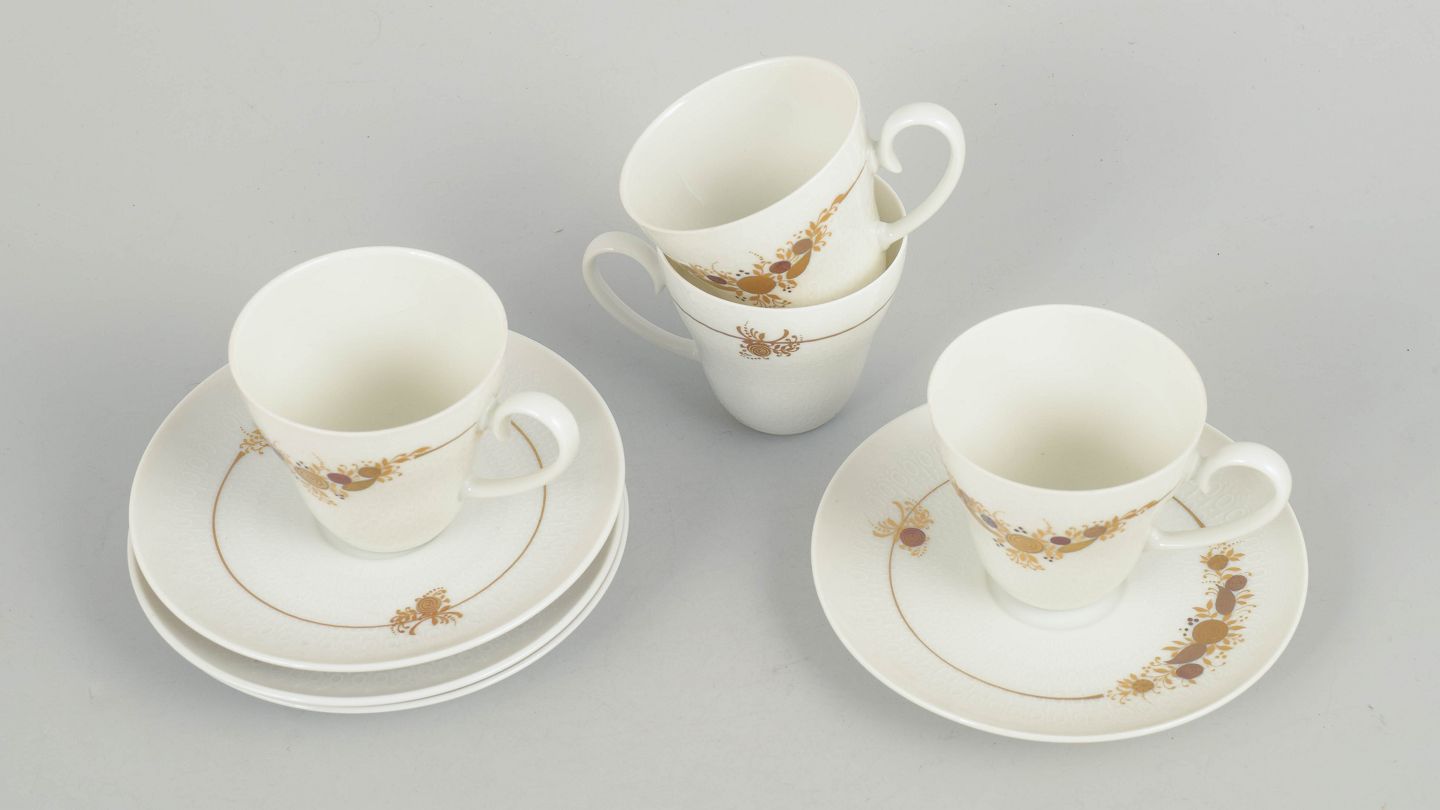 Set consisting of four coffee cups with matching saucers in porcelain decorated with the characteristic floral ornament from the Romanze series. The decoration appears in golden tones with fine detailing and an elegant, romantic expression, typical of Wiinblad’s design language in the 1970s.