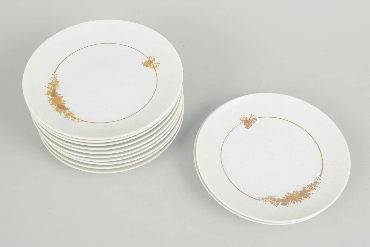 Set consisting of twelve cake plates in porcelain decorated with the characteristic floral ornament from the Romanze series. The fine decoration in golden tones appears elegant and detailed with a romantic expression, typical of Wiinblad’s design language in the 1970s.