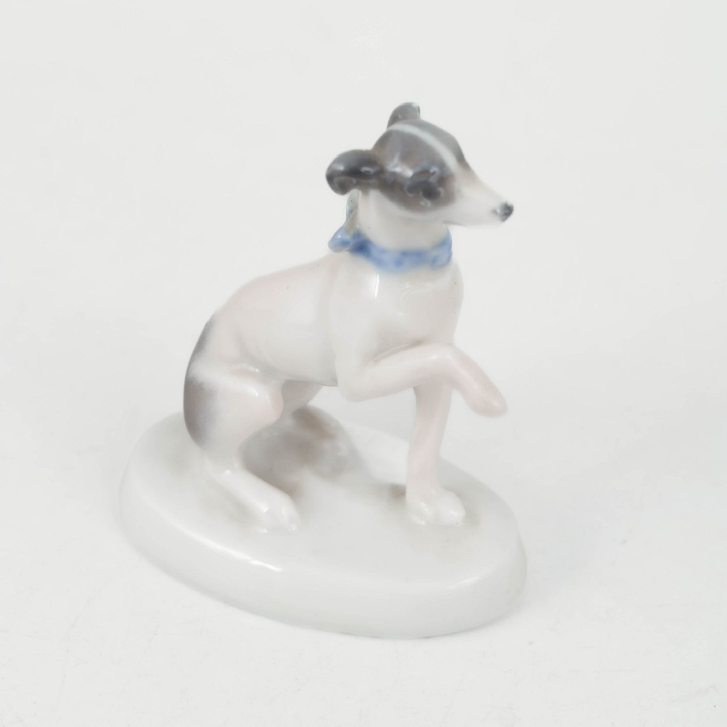 Fine naturalistic porcelain figurine of a seated greyhound with raised paw and an elegant slender form. Executed with soft glaze transitions in light tones and signed R. Sh., produced by Rosenthal around 1927.