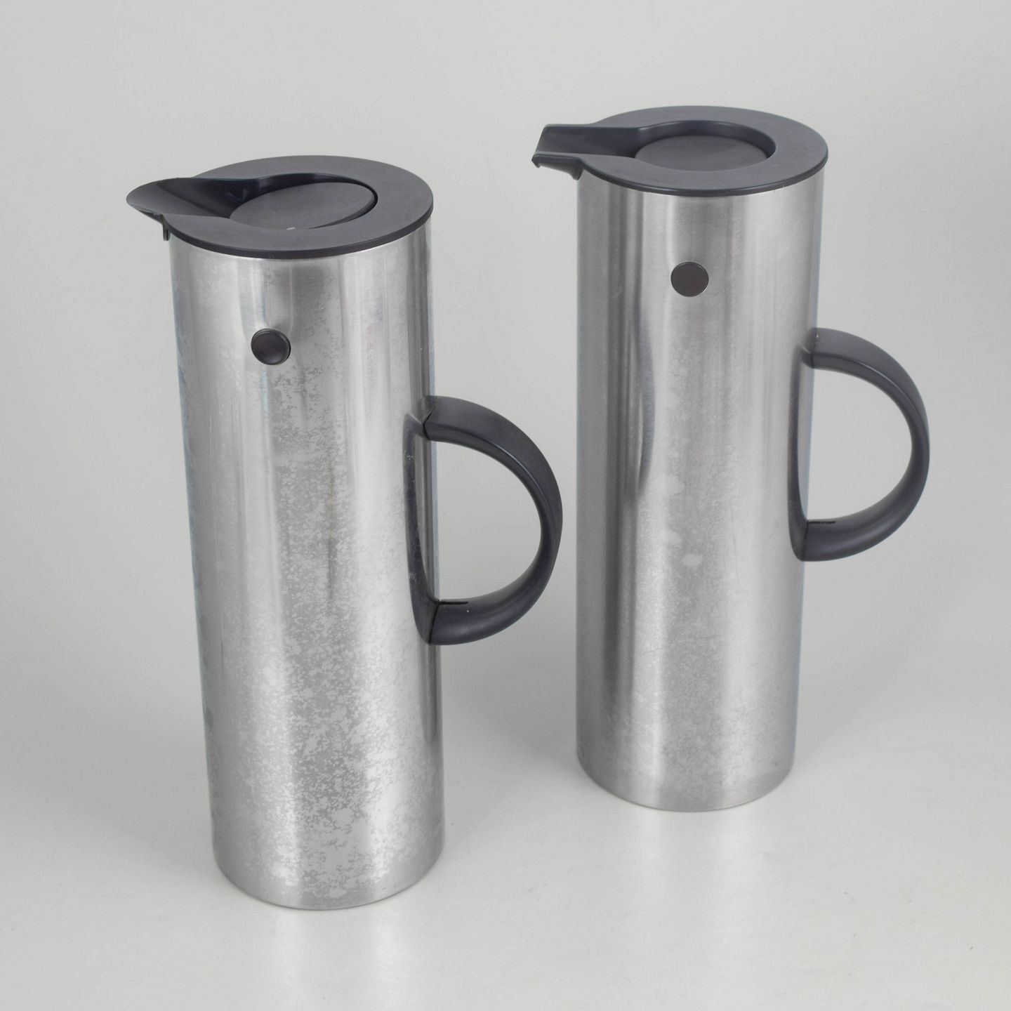Two cylindrical vacuum coffee pots in brushed stainless steel with the characteristic tilt-top stopper and black plastic handle. A model from Stelton’s iconic series, designed with a focus on functionality and minimalist aesthetics.