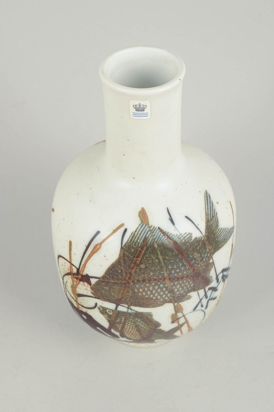 Large stoneware vase decorated with a stylised seabed motif featuring fish and aquatic vegetation in subdued brown, blue and green tones. Model number 1064 / 5363. First factory quality with original factory sticker.