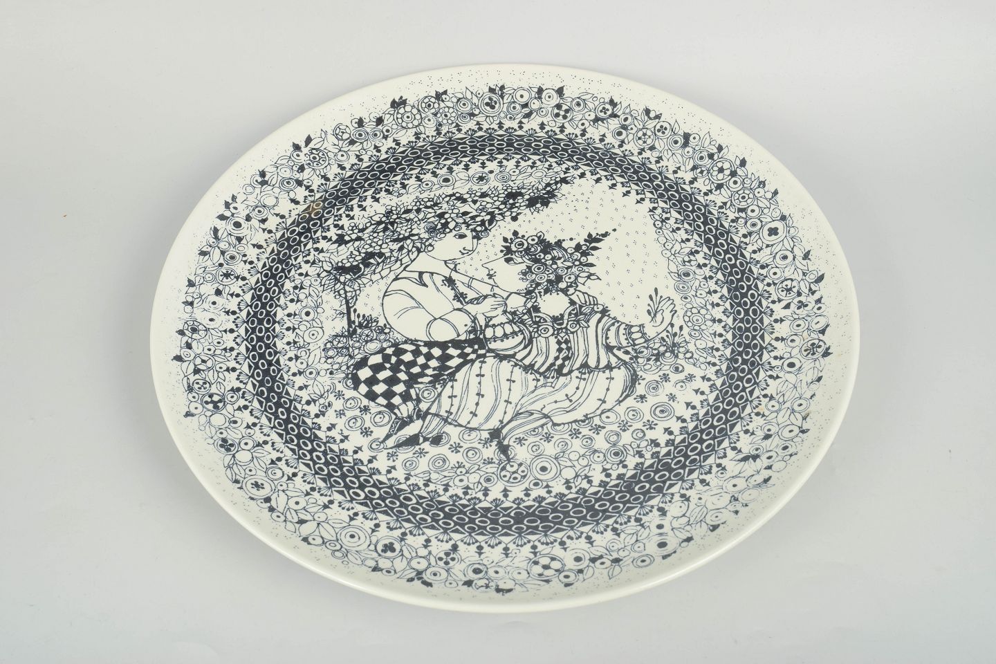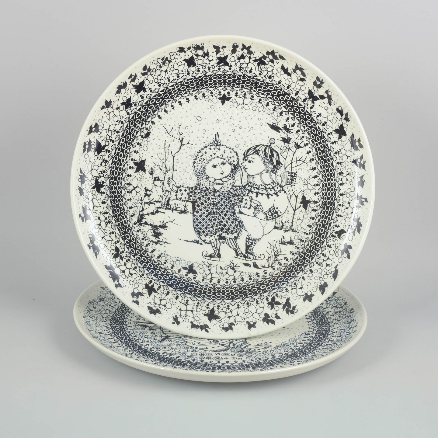 Decorative round faience dishes with black line decoration in Bjørn Wiinblad’s characteristic whimsical style, featuring figurative scenes and ornamental borders. The motifs represent the seasons winter and spring.