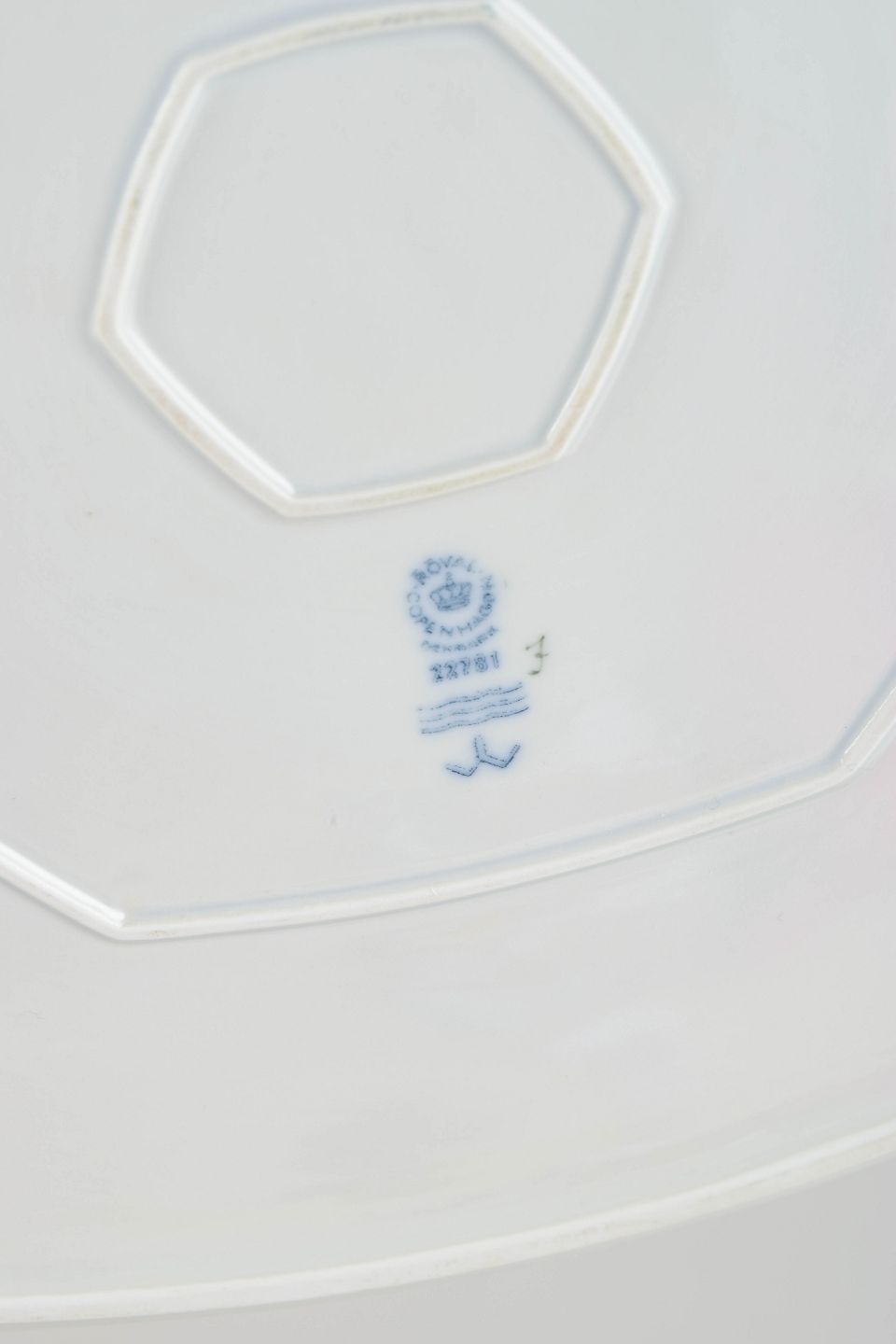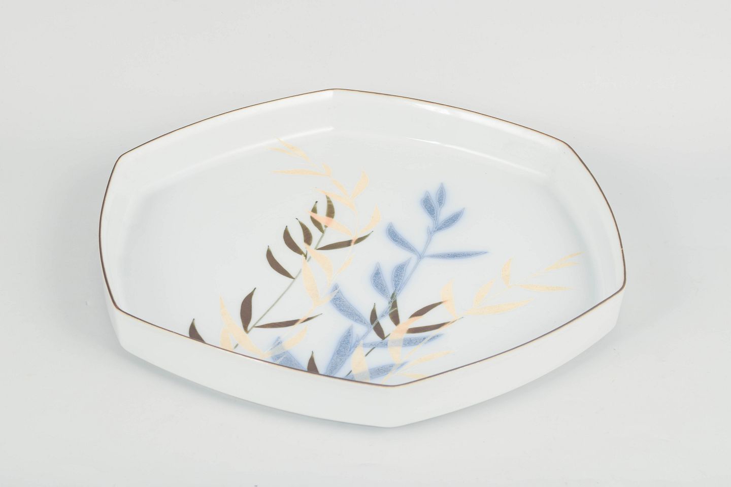 Large octagonal porcelain dish with stylised bamboo decoration in blue, golden and brown tones. Model 22781, first factory quality.