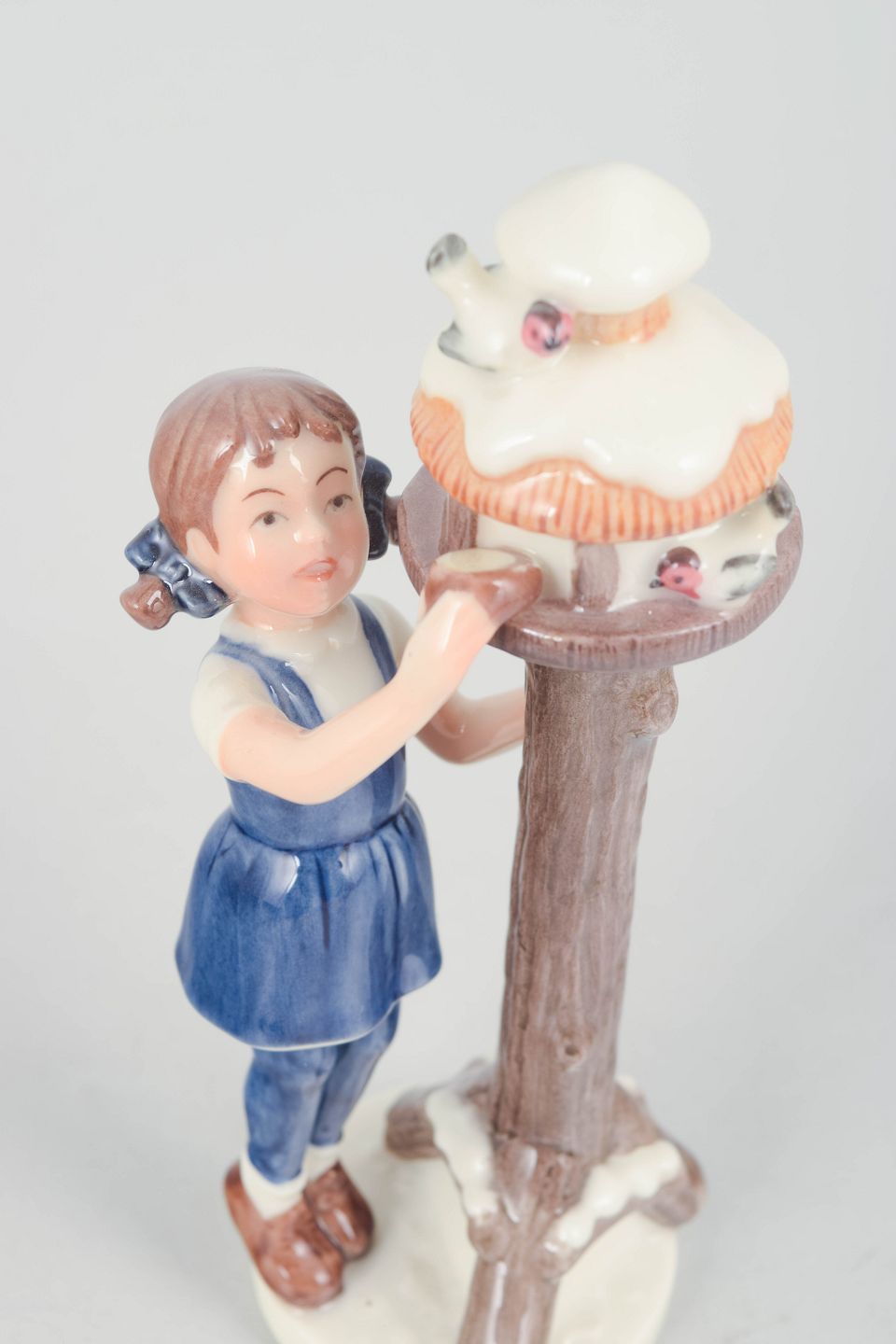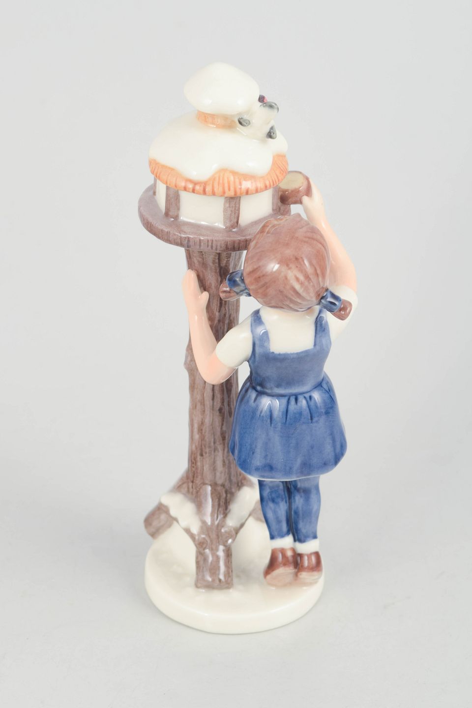 Fine porcelain figurine depicting a girl in blue attire standing beside a birdhouse on a tree trunk with detailed hand-painted decoration. Model 757, first factory quality.