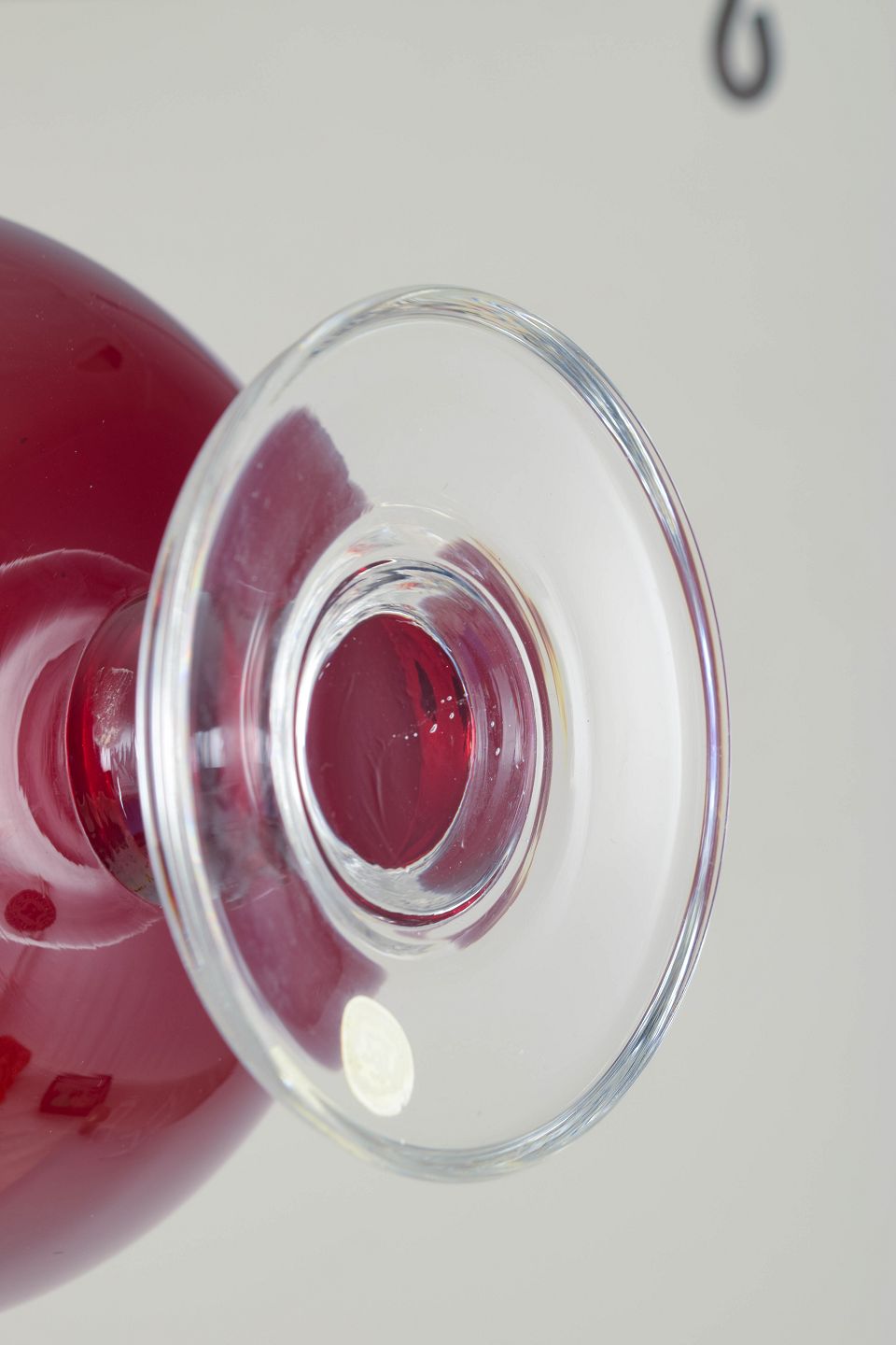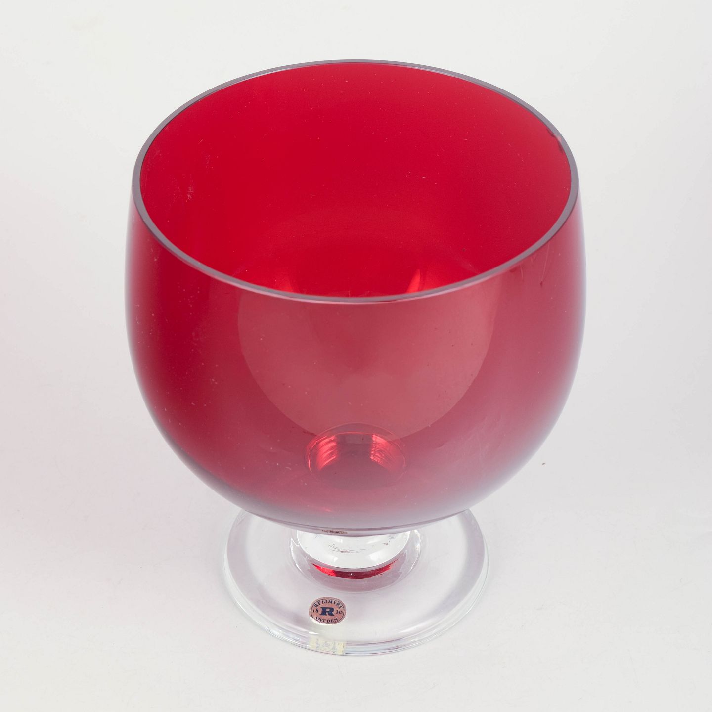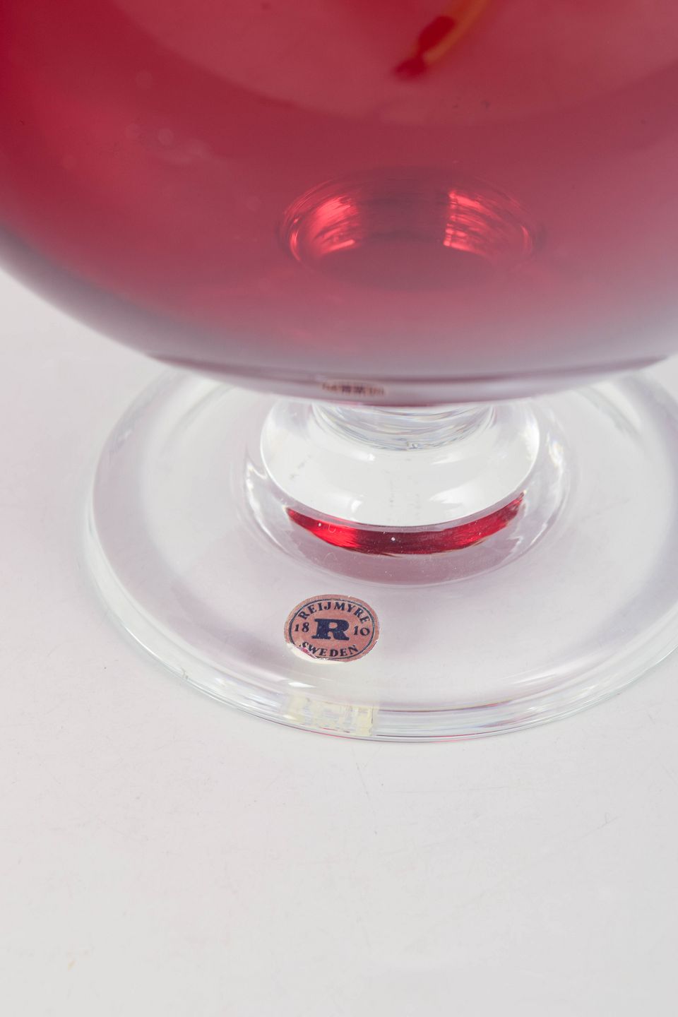 Mouth-blown glass in clear and red tones with a rounded bowl and short stem on a wide foot. Original Reijmyre Glasbruk sticker preserved.