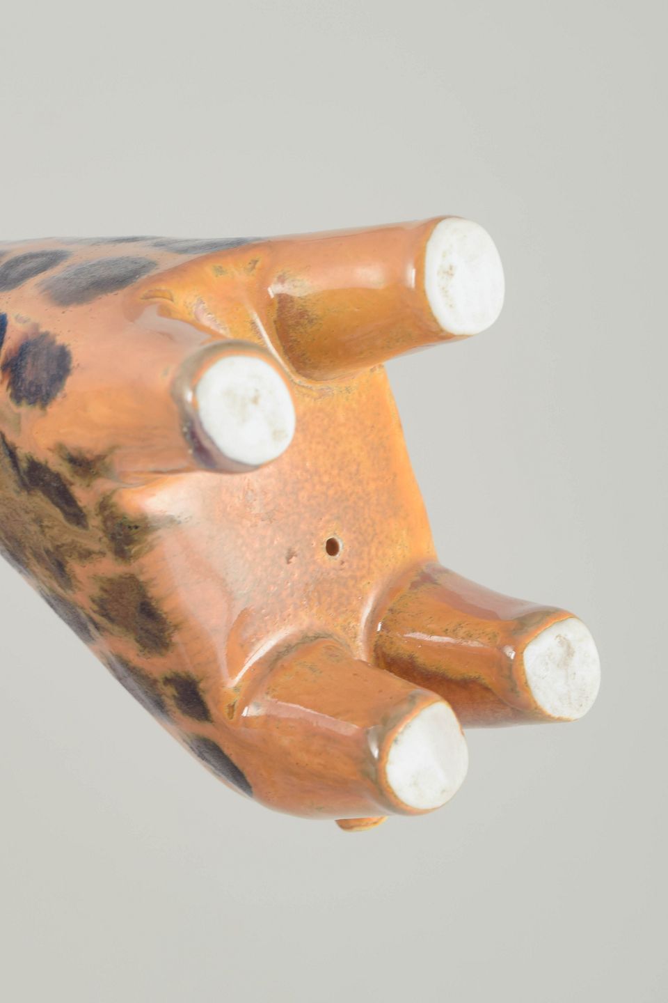 Decorative ceramic figure shaped as a giraffe with a stylised form and hand-painted dark spots on a warm orange glaze. A characteristic example of Swedish design from the period.