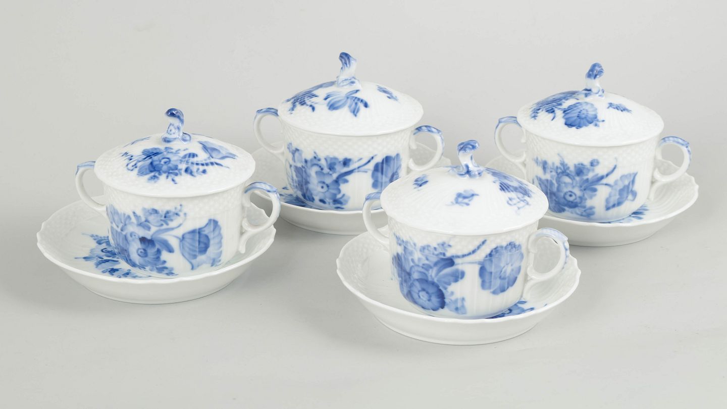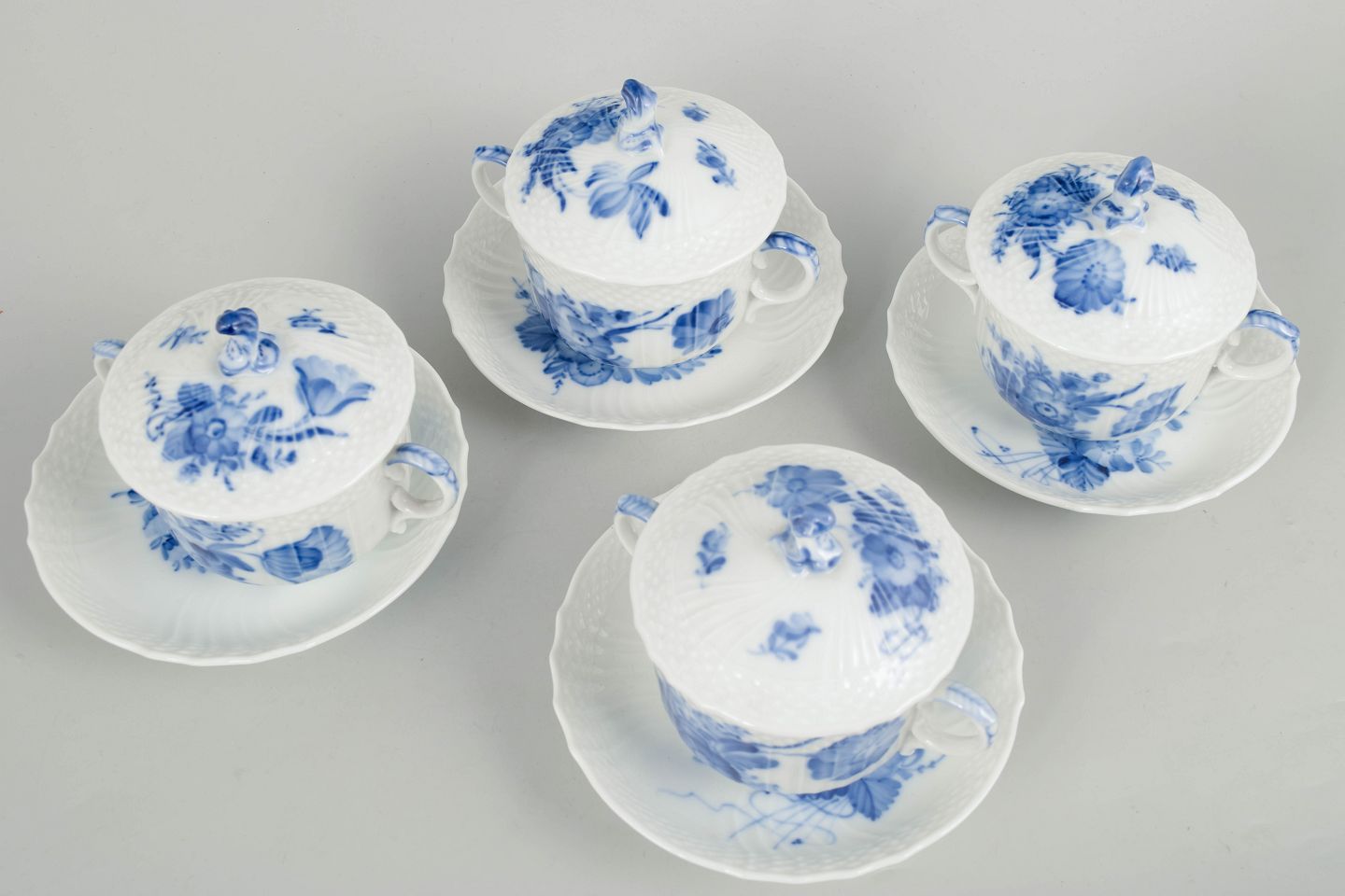 Royal Copenhagen Blue Flower Curved, set of four bouillon cups with matching saucers.