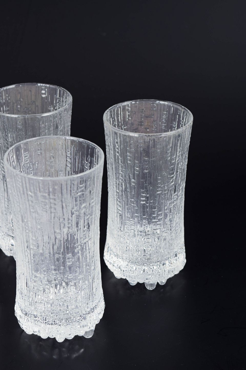Drinking glasses from the Ultima Thule series in clear glass with a distinctive ice-like texture and organic form, inspired by melting ice in the Nordic landscape, designed in the 1970s.