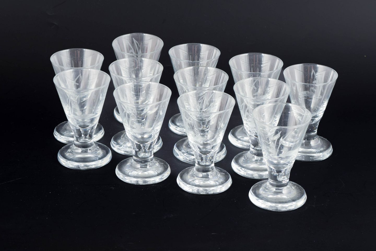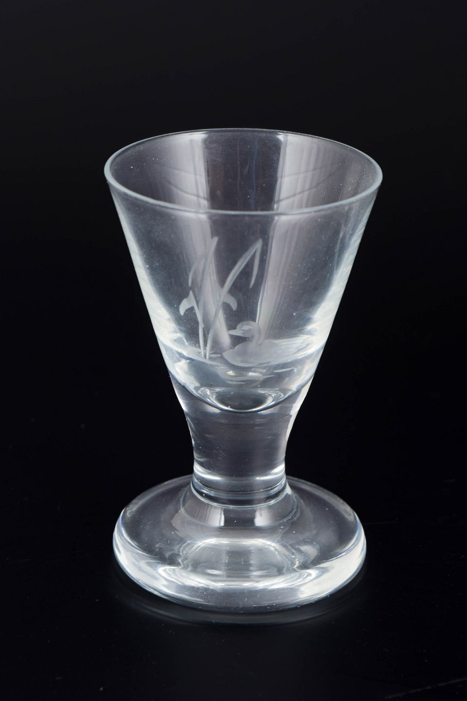 Mouth-blown schnapps glasses with engraved decoration of ducks and reeds in clear glass, executed in a classic interwar style with conical bowl and solid foot.