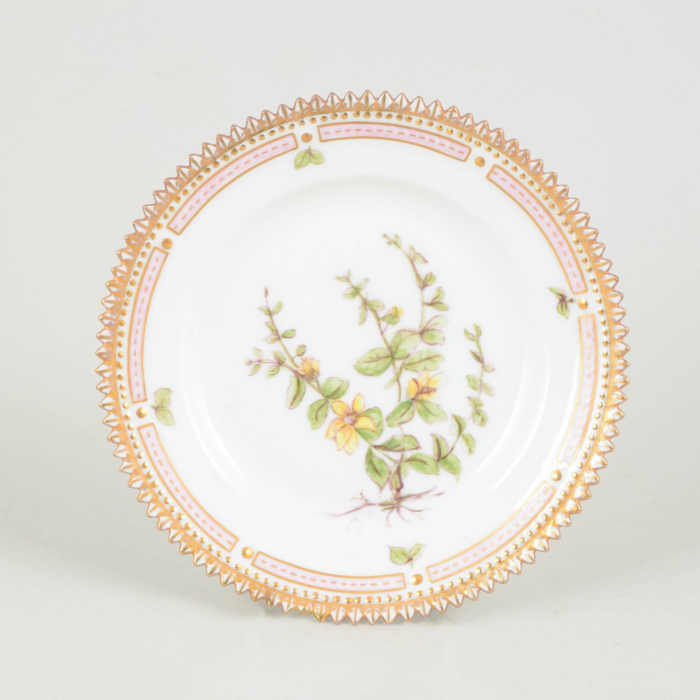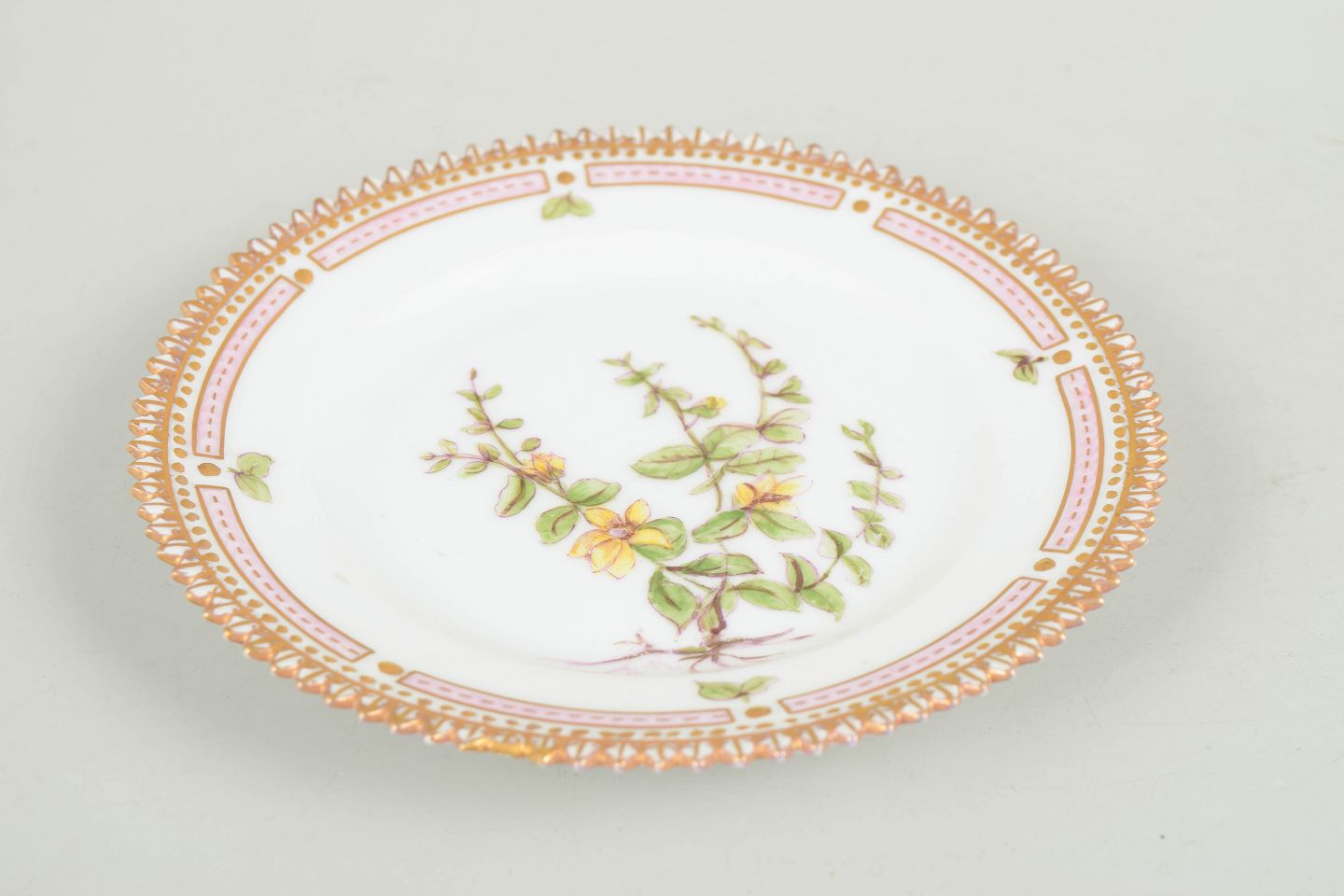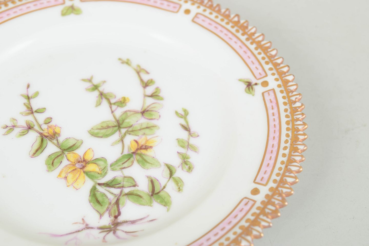 Hand-decorated porcelain plate with botanical motif from the Flora Danica series, decorated outside the factory, finely executed with gilded rim and highly detailed plant illustration.