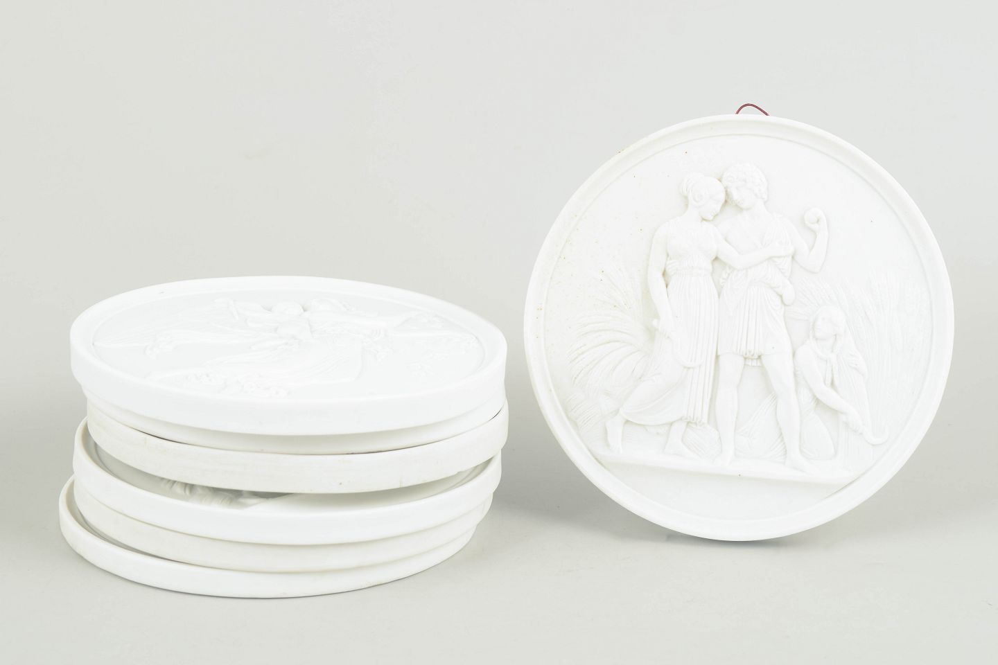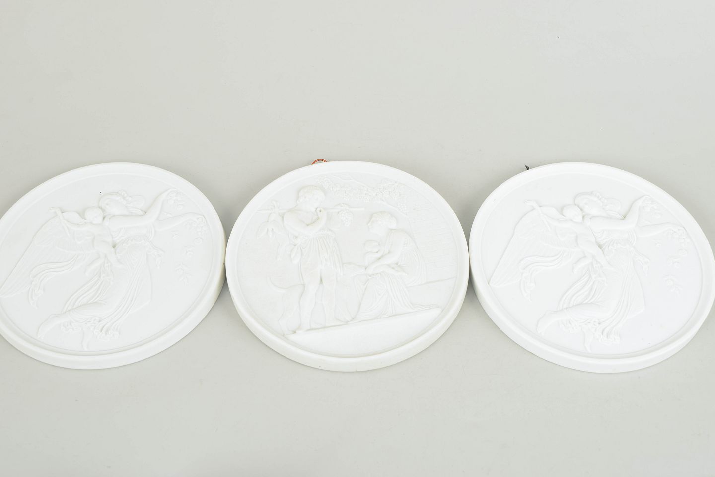 White unglazed porcelain reliefs with classical motifs after Bertel Thorvaldsen, executed in fine biscuit with detailed figural decoration and suspension mounts on the reverse. First factory quality.