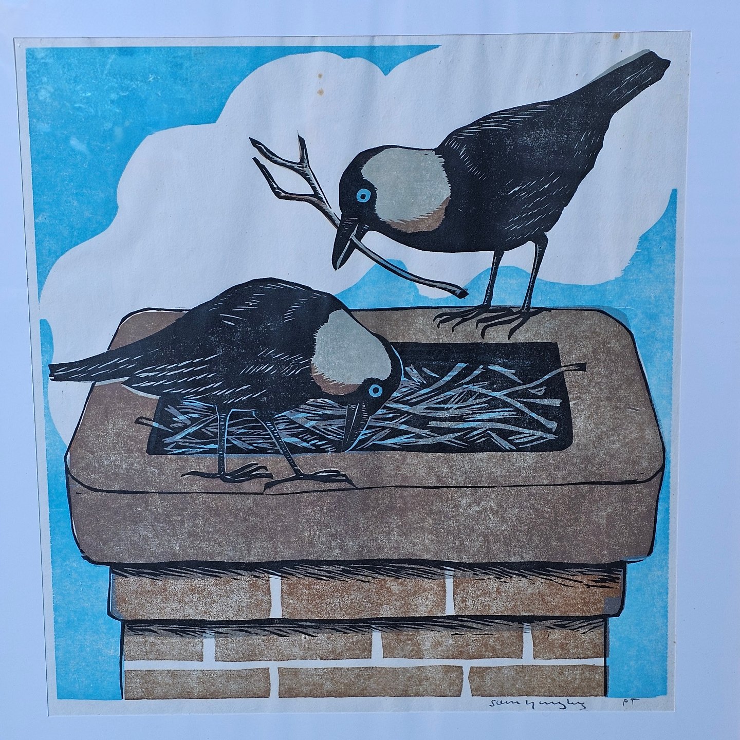 Prøvetryk med titlen "Sådan bygger vi" med motiv af to fugle der bygger rede. Monteret i træramme