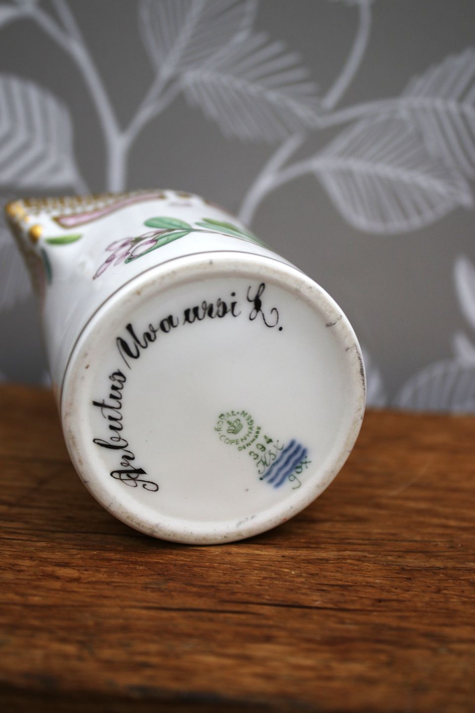 Creamer in Flora Danica set produced by Royal Copenhagen in Denmark. H: 7cm. Dia: 5.5cm. The motif is a hand-painted botanical illustration of the plant Arbutus Uva-ursi. (Mispelris)