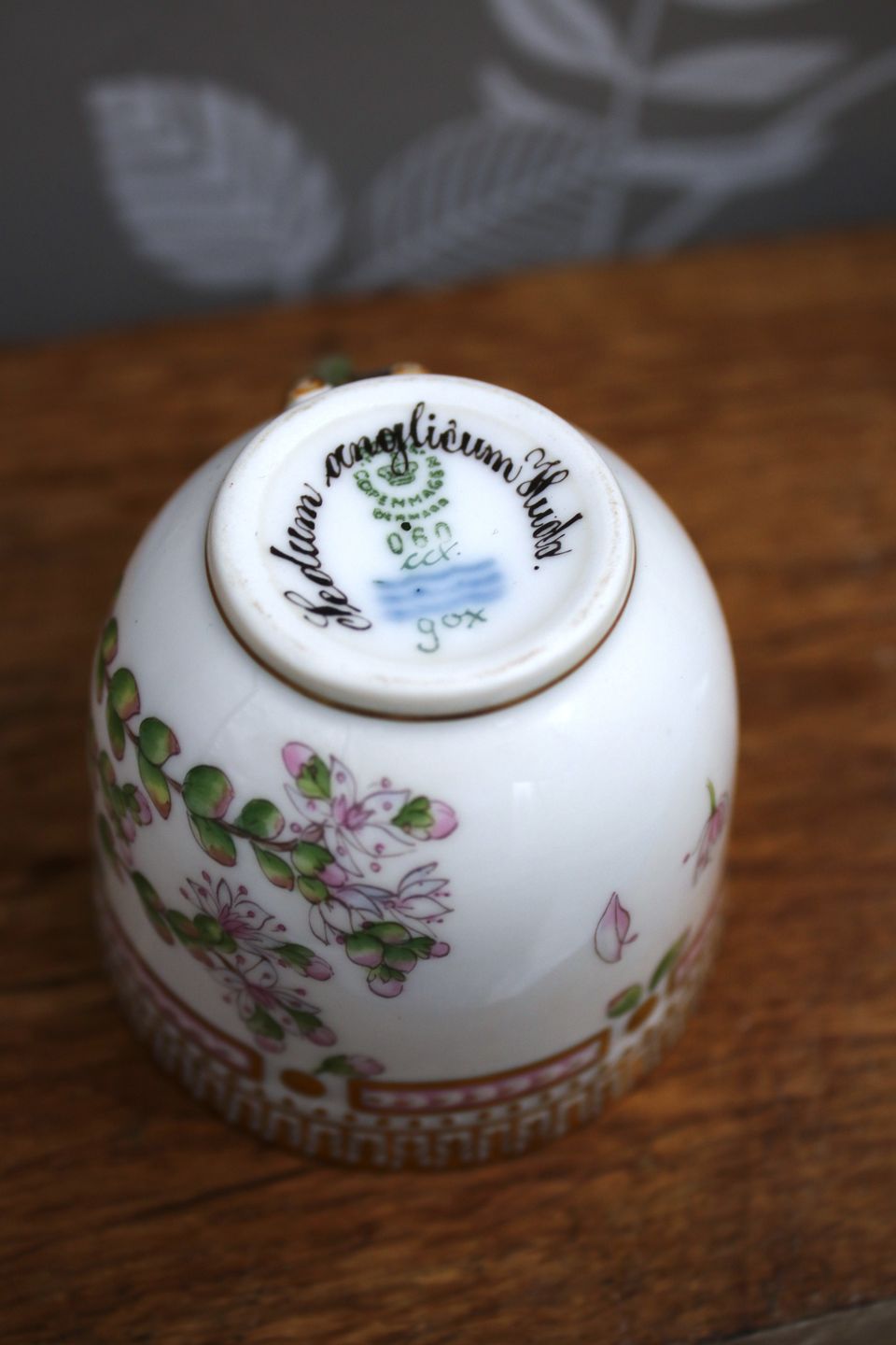The motif is a hand-painted botanical illustration of the plant Sedum anglicum.