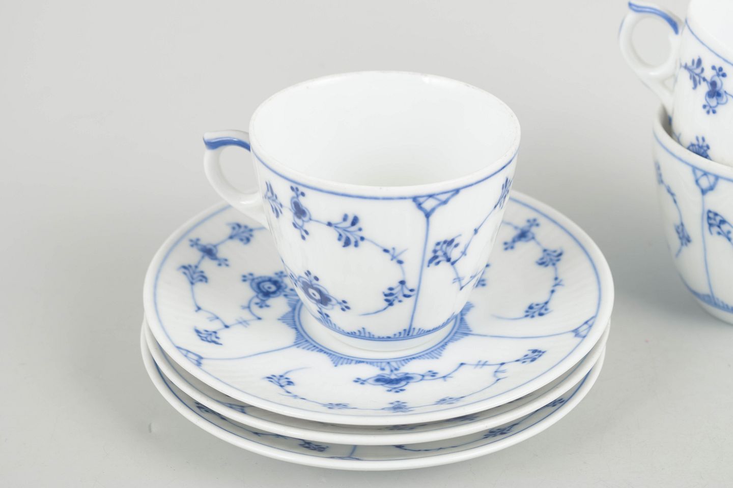 Three coffee cups with matching saucers in porcelain, hand-painted in underglaze blue in the classic Blue Fluted Plain pattern. Model 1/80. First factory quality.