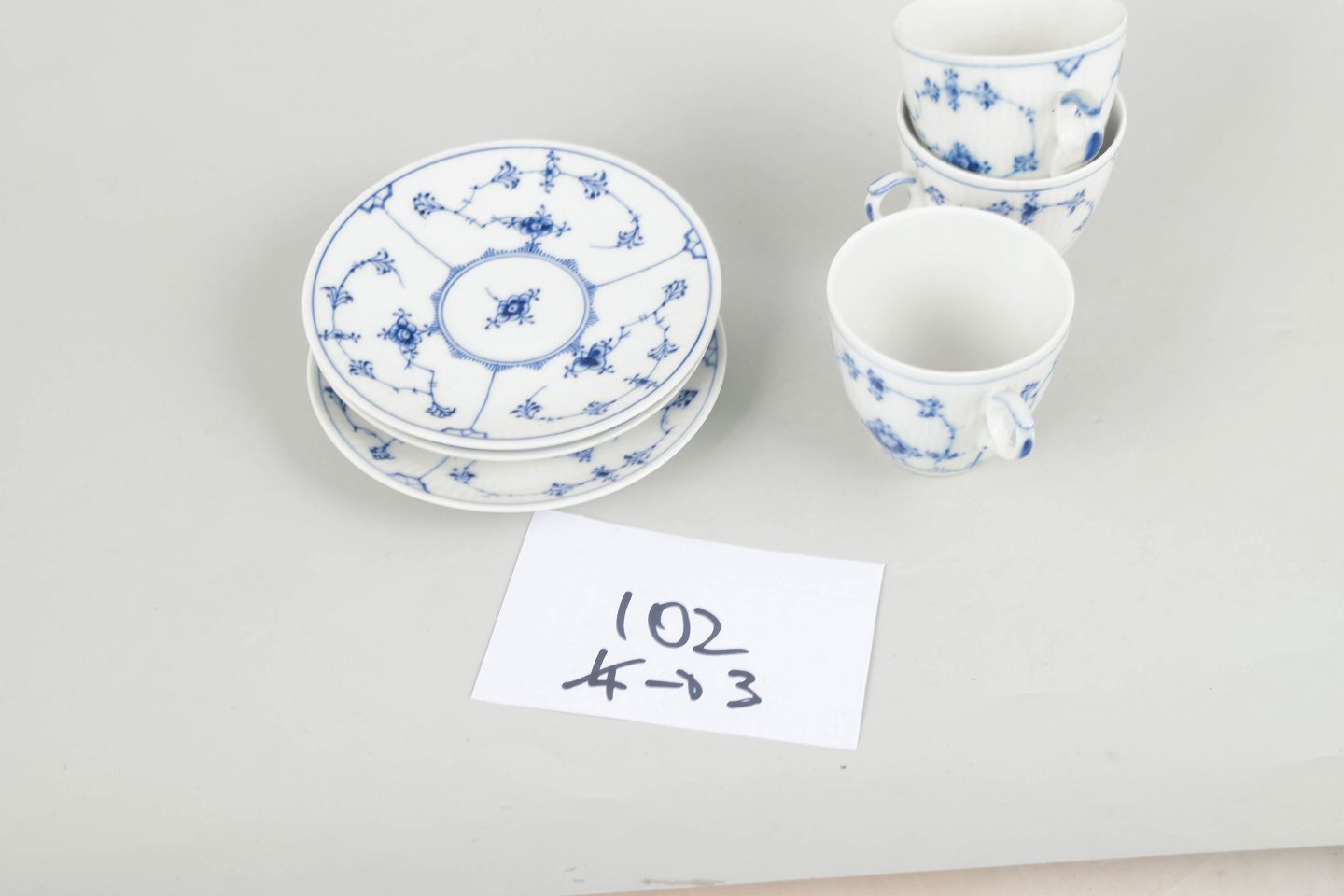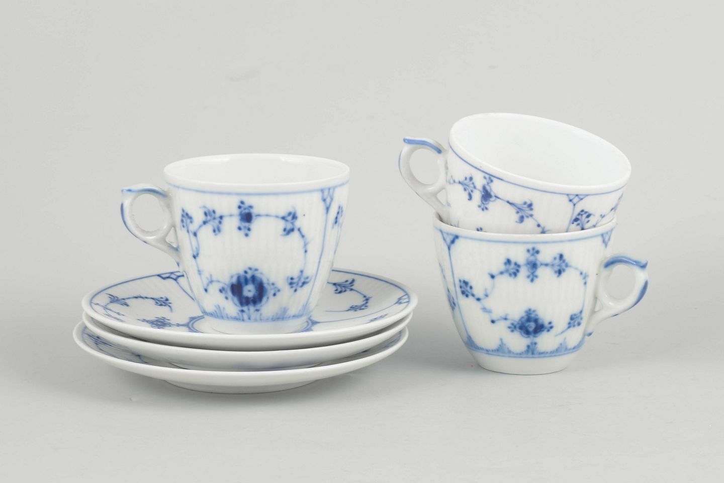 Three coffee cups with matching saucers in porcelain, hand-painted in underglaze blue in the classic Blue Fluted Plain pattern. Model 1/80. Some first factory quality, some factory seconds marked with one or two incised lines.