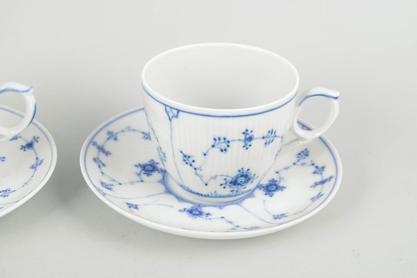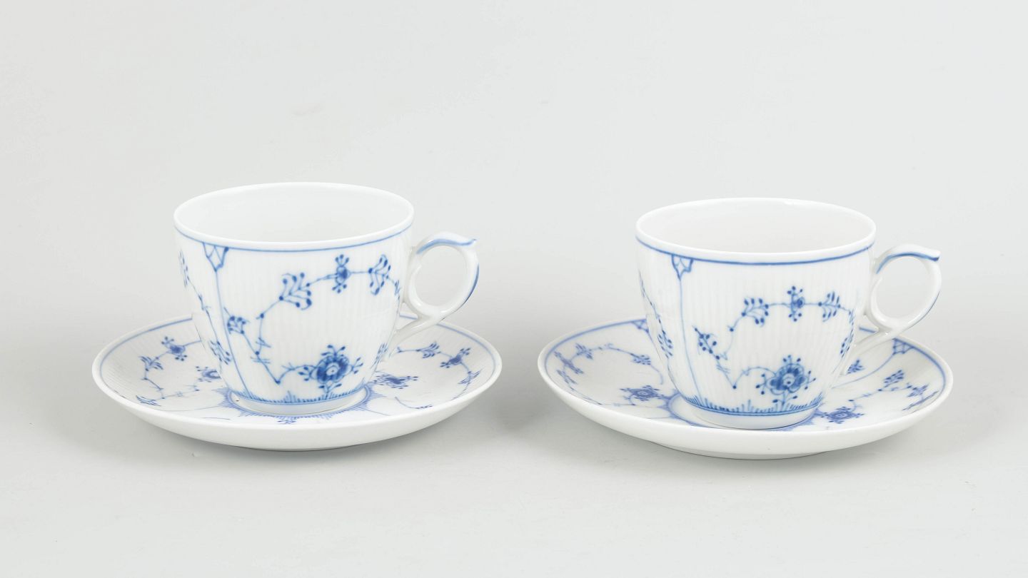 Breakfast cups with matching saucers in porcelain, hand-painted in underglaze blue in the classic Blue Fluted Plain pattern. Rare. Model 1/78. First factory quality.
